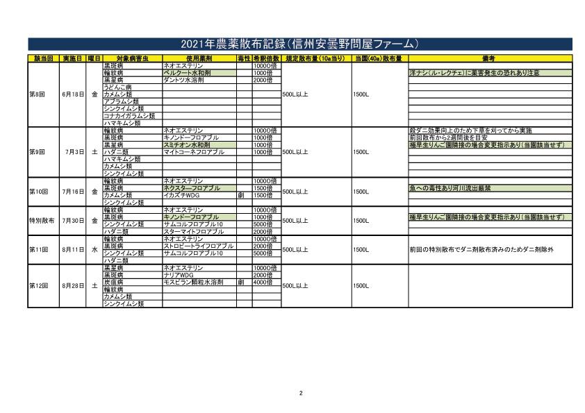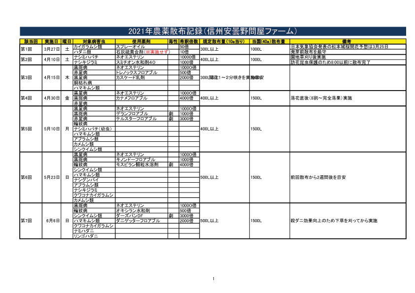 当農園の2021年度農薬散布状況を示したデータです(シーズン中13回)。JAが示す推奨散布量よりもわずかに散布量を抑えていますが、病害虫の発生状況を観察しながらの調整です。