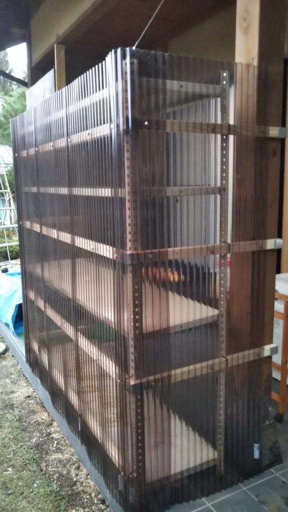 野菜をちょっと置いておく場所がほしいと思っていたところ、物置に長年放置されていたスチール棚があったので、想像力とやる気に火をつけて再利用となった。