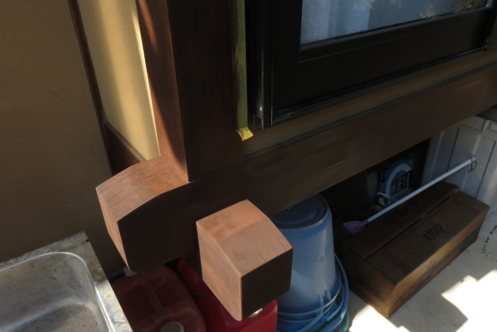 築20数年経過しただろうか、時々外壁塗装のセールスが訪問してくるようになった。おめでとう!そうしたセールスに目を付けられるような風格を備えるにようになったのだ。専門的な知識はないので、ホームセンターやネットで情報収集する。家族には見栄えの悪さは勘弁してもらう事にしている。木部の塗装前に、塗りムラを少しでも防止しようと表面を磨いた。