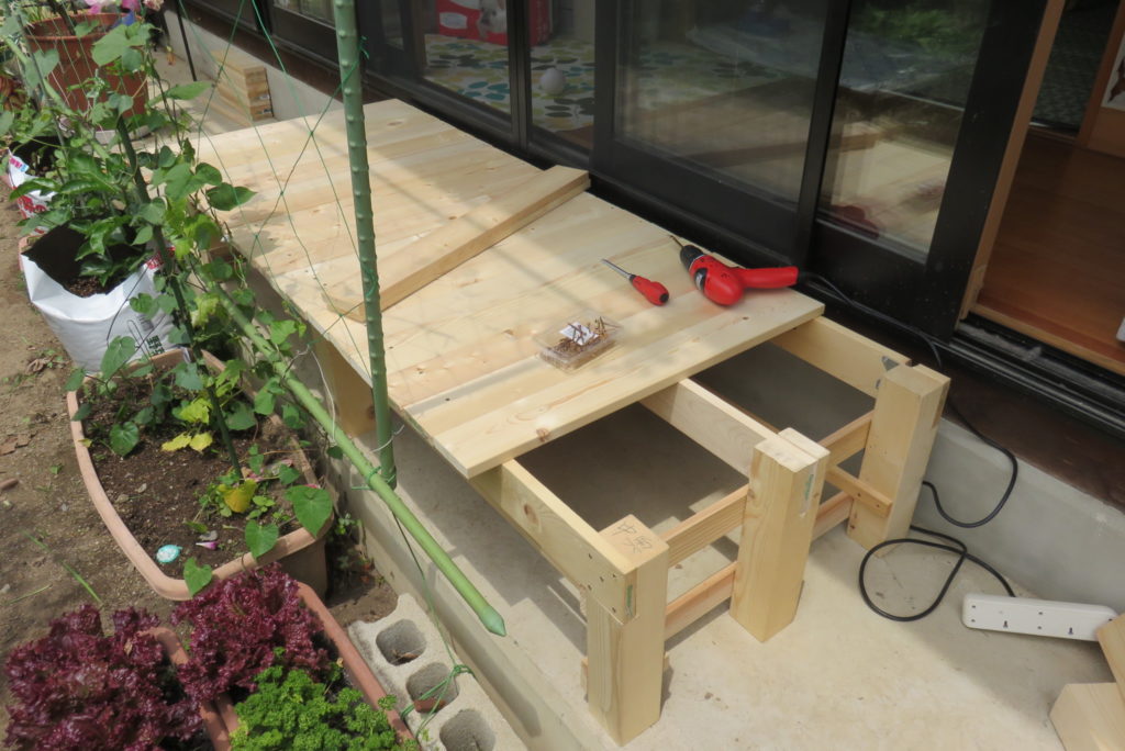 我が家の愛犬ミルキーは室内犬として暮らしている。しかし、いつも南の縁側から窓の外を眺めている。サッシの外には「犬走り」があるので、段差のない簡単なサンデッキを作ってやり、自由に往来できるようにしようと考えた。同じものを2台作ってやり、外に出られるようにしてやったのだ。苦労して作ったのに最初は警戒して乗るのをためらっていた(映像)。