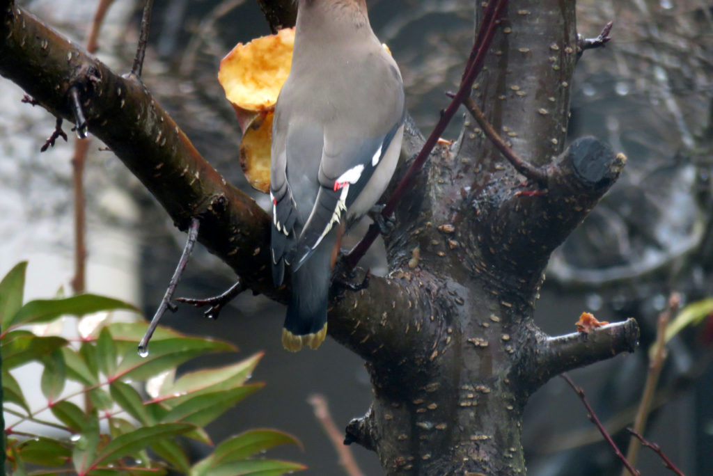 好物はヤドリギの実だというが、庭の木に刺しておいたリンゴに大集団でやってきた。私が使っている頼りないデジカメだが、カーテンを引いた窓から数メートルの所に来てくれたため、うまく様子をとらえる事ができた。