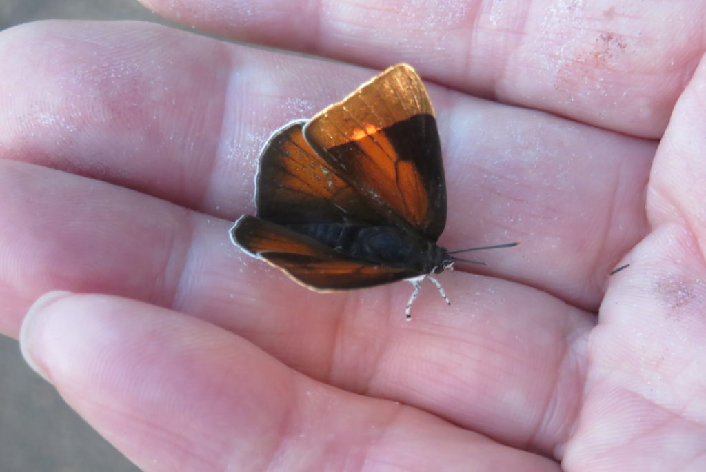 ウラギンシジミはその名の通り、羽根の裏側が銀色をしている。オスは表にオレンジ色があるので、気付き安いせいかオスばかり見かけていたような気がする。シジミチョウの仲間の中では比較的大型で、昆虫図鑑では40㎜とある。