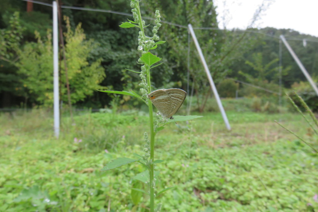 ビーバーで草刈りをしていたところに、ウラナミシジミがやってきた。以前から時々目撃していたが、少し手を止めて行方を追っていたら草にとまったので写真を撮った。