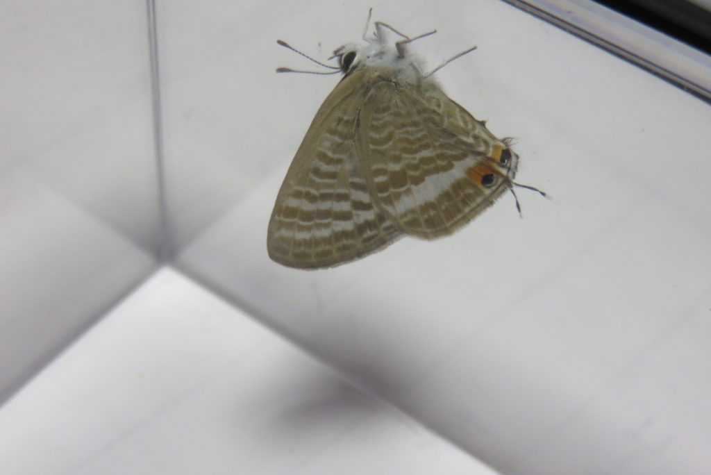 しかし、何とも不満足な状態だったので、すっぽりと手に納めてプラスチックケースに入れてから写真を撮ったが、とまっている時の羽根は裏側しか見えない。強引に羽根を開いてその表面を撮影するのも何となく酷だったので逃がしてやった。