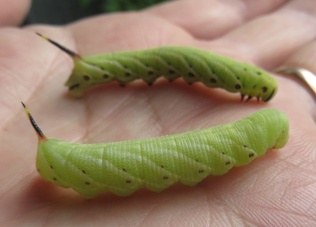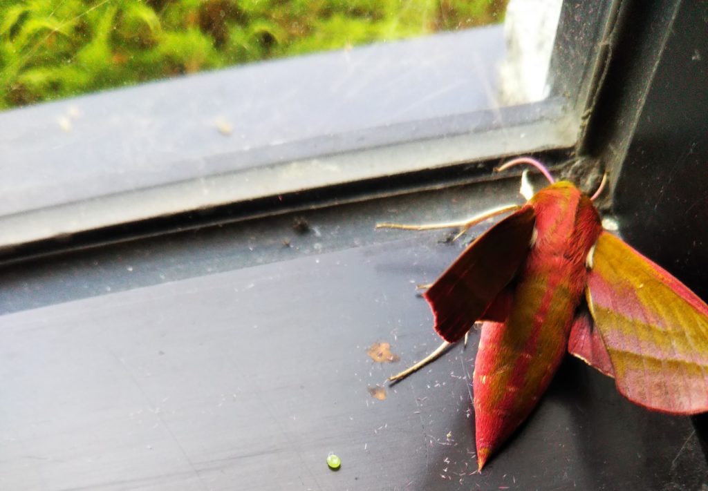 最近になってビルの窓枠の所にいるベニスズメガを見つけて、ようやく成虫の写真を撮影できたのです。これで幼虫と成虫の写真セットが出来上がりました。