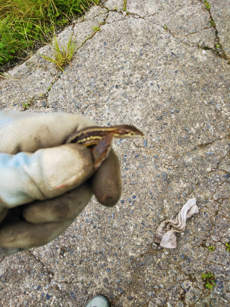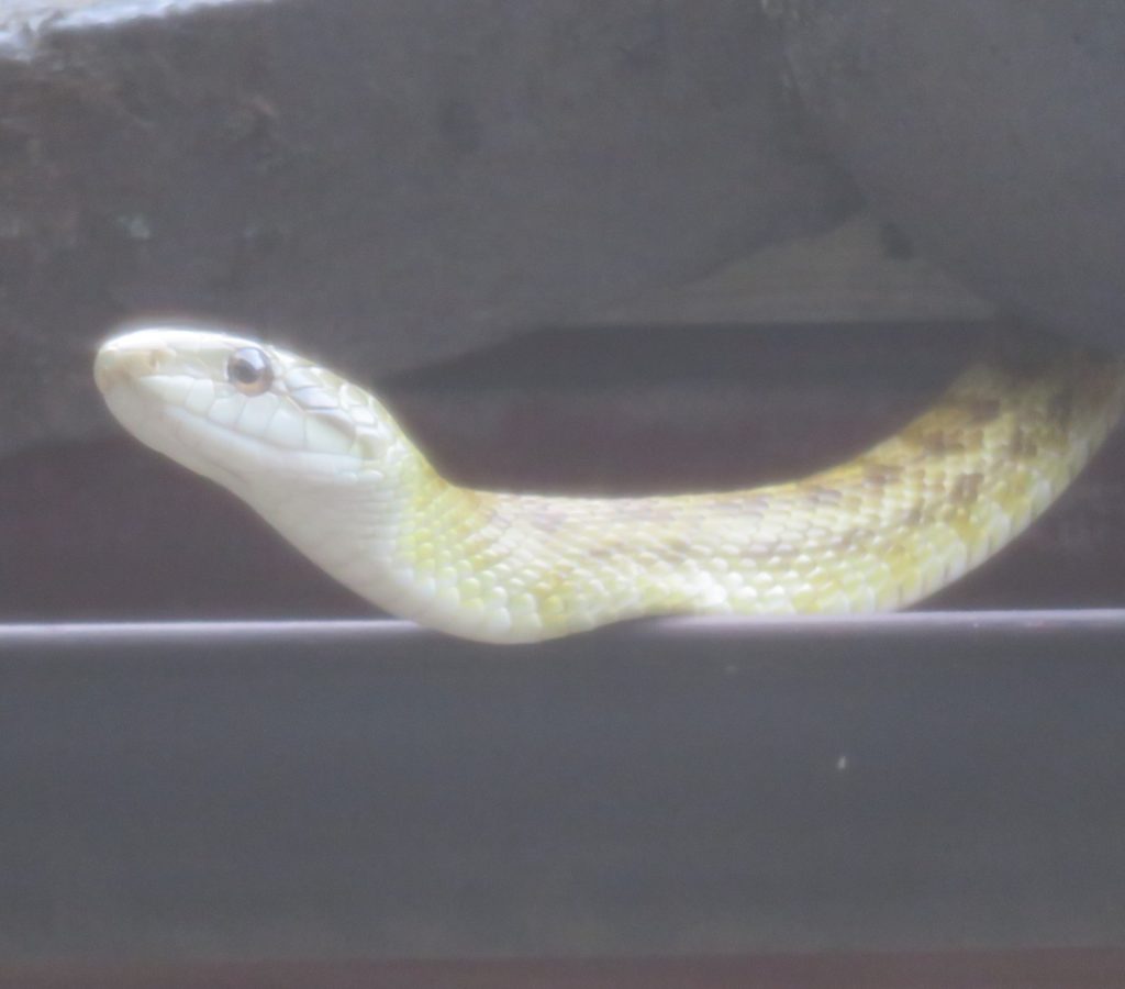 私は毒でもない限り、爬虫類に対してもフレンドリーにしてきたつもりだ。すぐに目を背けたりすることはないので、このあたりに生息する蛇やトカゲには、挨拶くらいはするので特徴はある程度知っている。しかし、この「コーンスネイク」らしき蛇には初めて遭遇する。ペットショップで売られているようなものが路上で発見されるのは好ましくない。飼育中に逃げ出してしまったのか、搬送中に落としてしまったのかは不明だ。