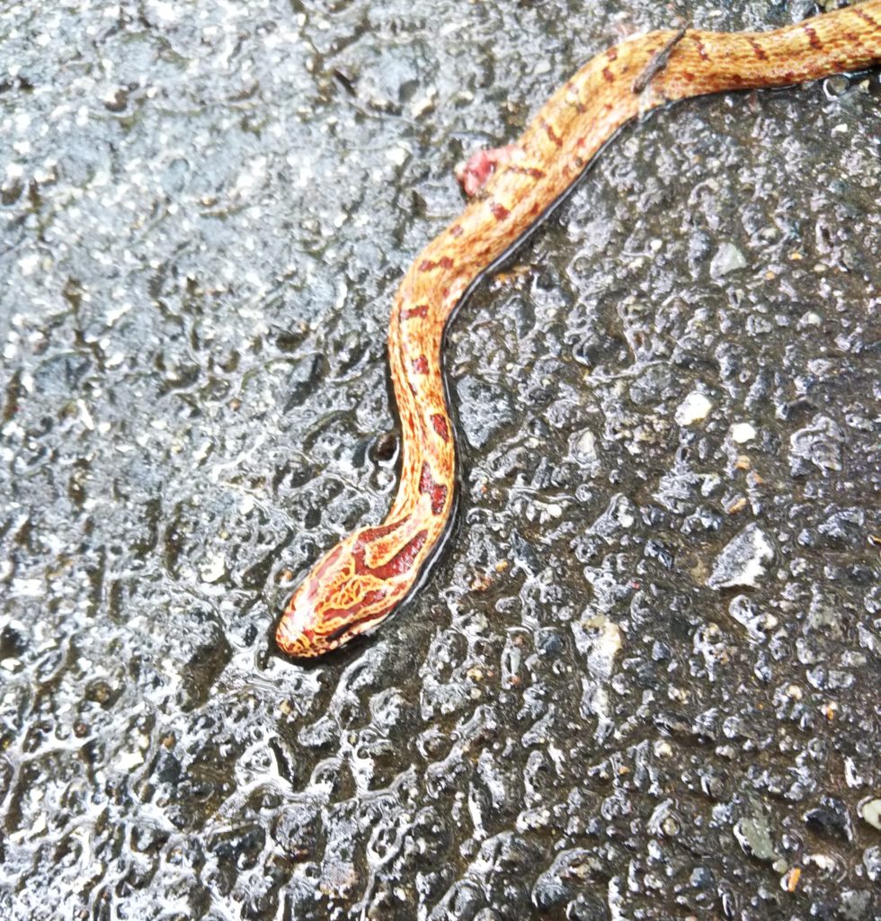 雨上がりに散歩していると、あまり見かけた事のない蛇を見かけた。車にひかれたのかすでに息絶えていたが、グーグルの画像検索をすると「コーンスネイク」と表示された。確かに特徴はその通り。