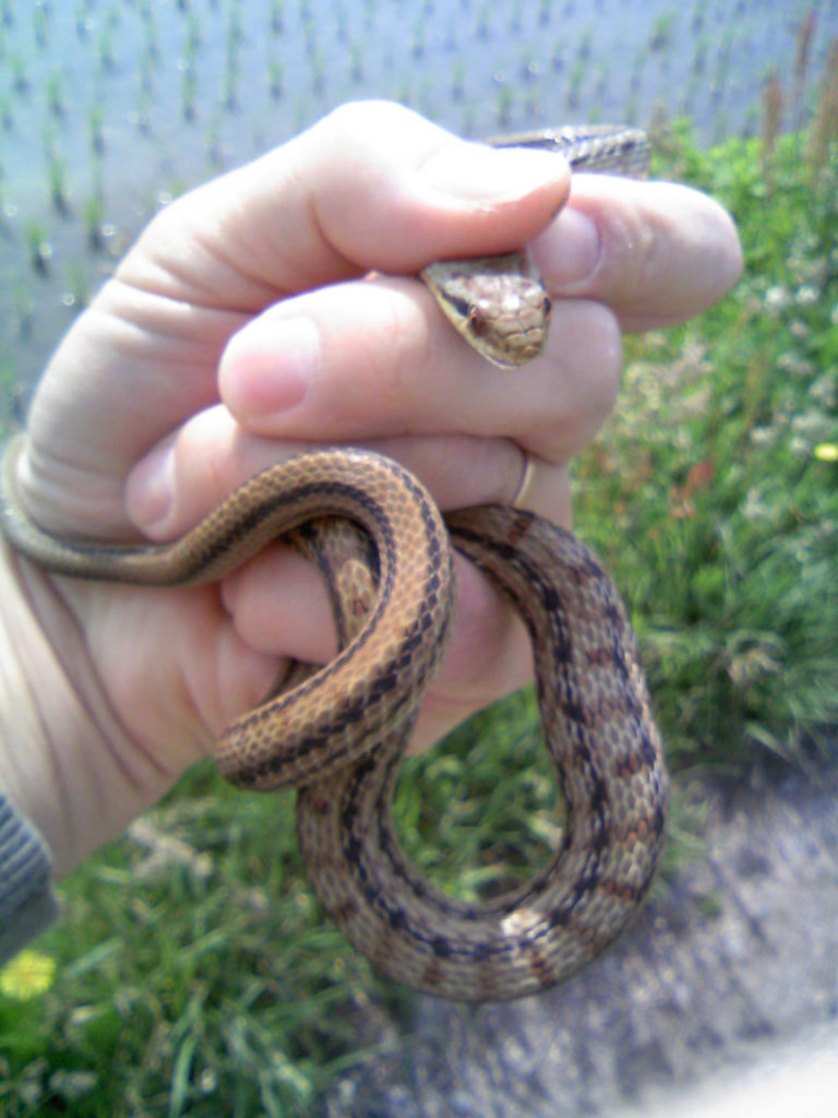 自宅周辺で出会う爬虫類としては、アオダイショウ、シマヘビ、マムシ、ヤマカガシ、ジムグリ、カナヘビ、日本トカゲと言ったところだろうか。ヤマカガシと日本トカゲの写真が見つからず掲載できない。