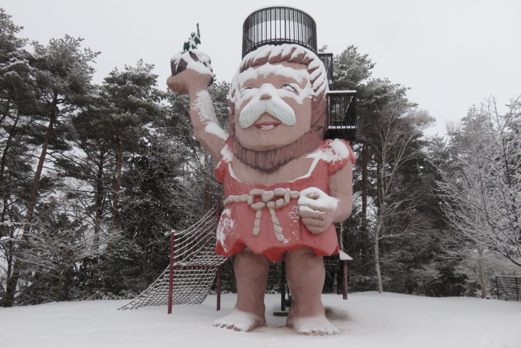 頂上からの眺めはというと、いったん止んだ雪が降り始めた事もあって、視界が悪くて市街地は見えなかった。