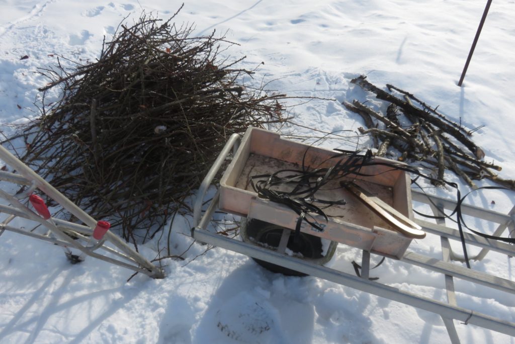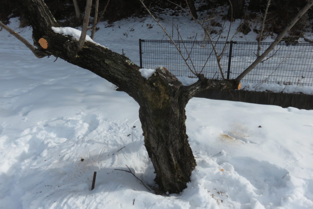 木の背丈が大きくなり、梨の棚の高さを超えるほどになってきたので、どうすればよいのか勉強することもなく切り詰めた。根元からは新しい枝も出ているので、少し残しておいて古い枝から更新する道筋も考慮した。
