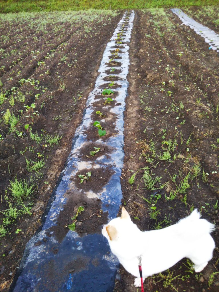マルチを敷いて地温をあげるようにしつつ、日中の気温が高い時に苗の葉がマルチに触れて焼ける事を防止するために、ワラを敷いたり、寒冷紗で霜よけしたりしていた。しかし、植えた苗の2割は元気がない状態だった。