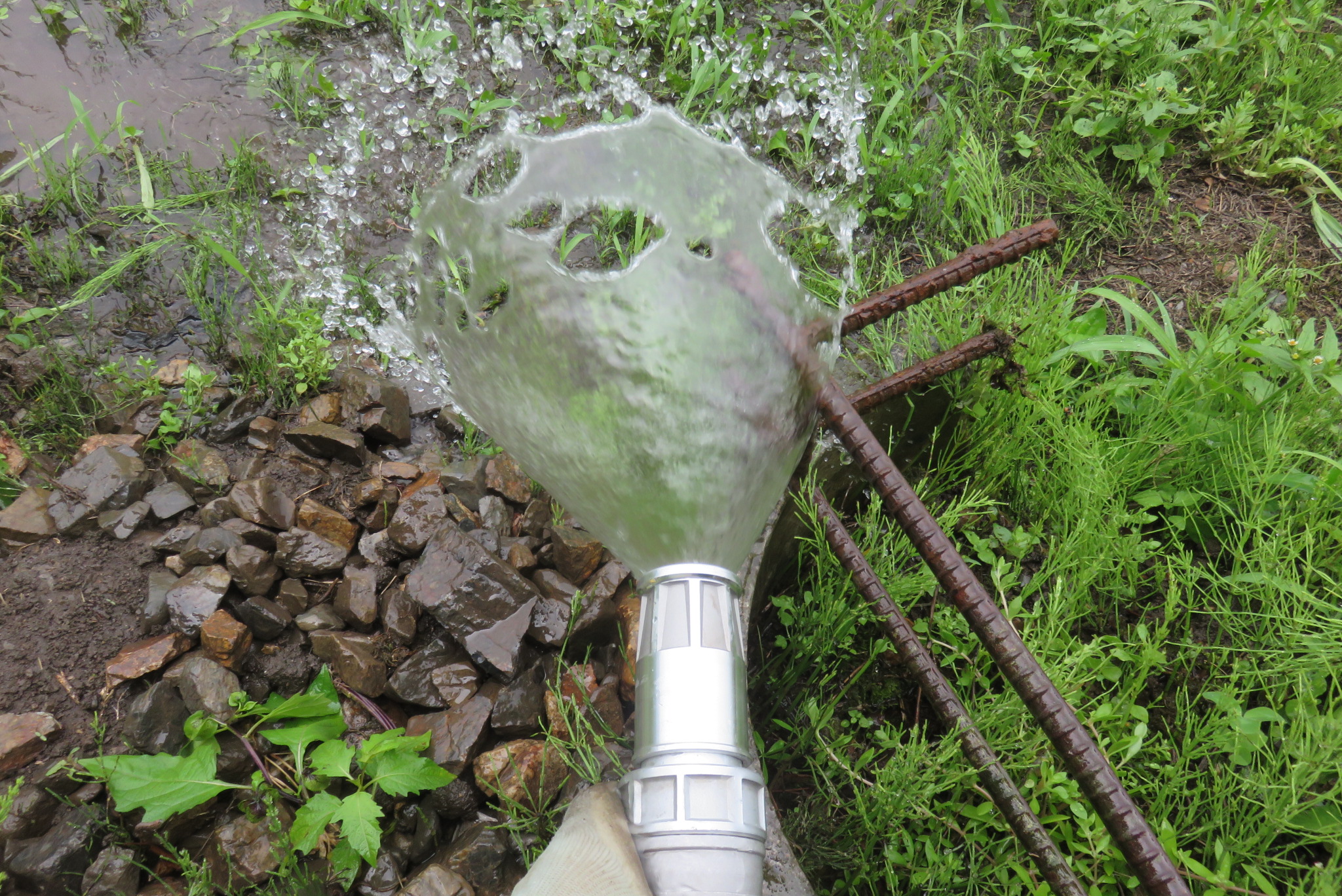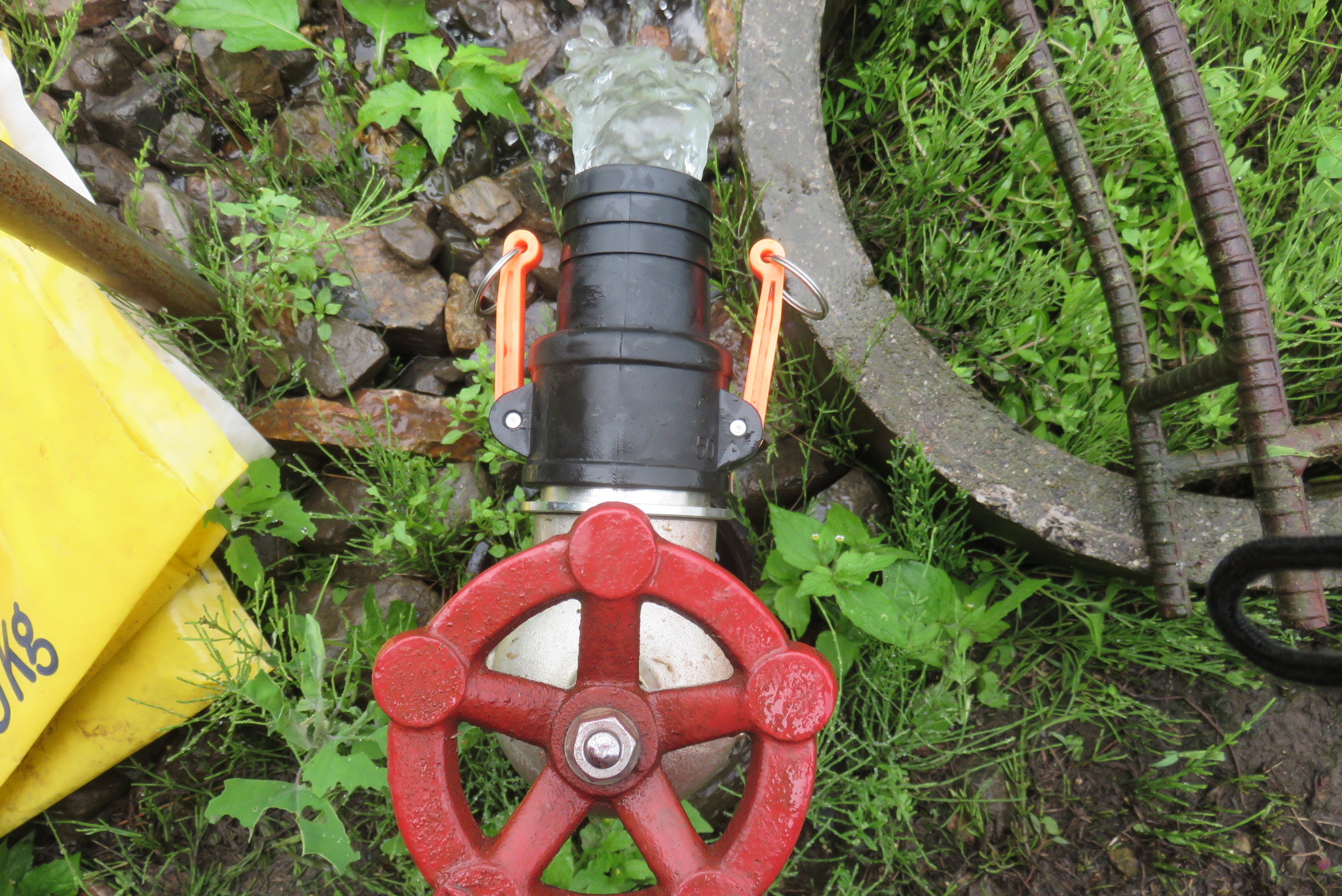 水の供給源となるアングルパイプは50㎜なので、解放するとかなりな水圧になる。ホース内の圧が高まると屈折部分を許さない。ピンと伸びて台座も容易に押し倒すのでバルブを調整しながら適切な散水状況を作り出さなくてなならない。