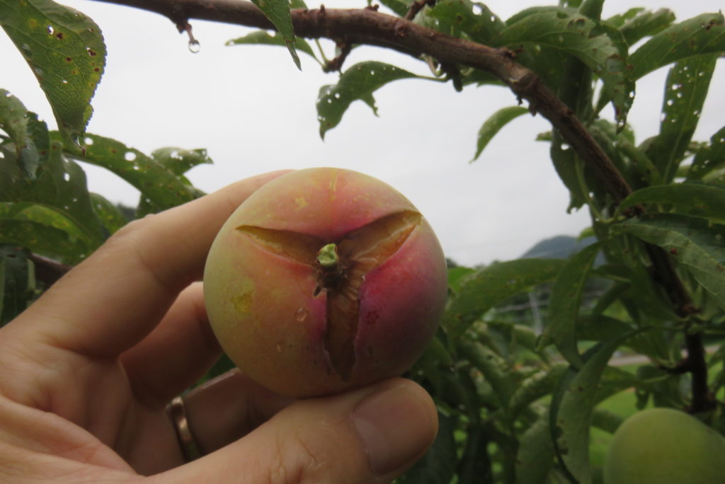 実は、以前は月光やケルシーに袋掛けをしていたこともあるし、紙傘をかけた事もある。早生の月光については袋掛けも紙傘掛けもやらない事にした。テストの結果、月光については特別な効果も期待できず必要のない作業と判断した。ただ、このところ雨天が続いたためか月光の軸付近の裂果が目立っている。これが腐敗につながっている様子もうかがえる。こうした状況を袋掛けで抑止できるのかは不明で、テストして有意差を検定できるほどの栽培量はないし、余裕もないため省力化を優先した。