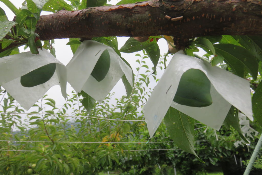 当園で栽培しているすももは、月光、ケルシー、太陽、貴陽に加えて、今年は受粉用としてサンタローザを植えた。摘果は終えているが、早生の月光以外のすももには傘掛けをすることにしている。