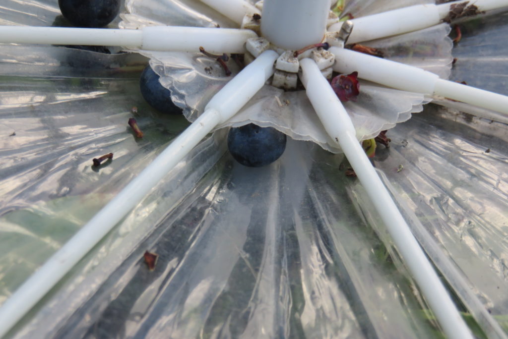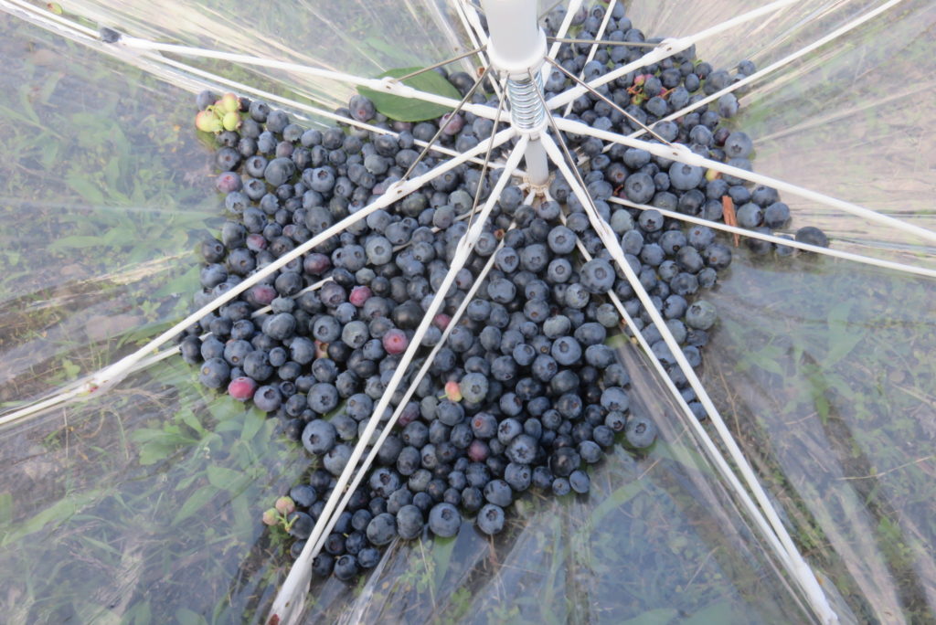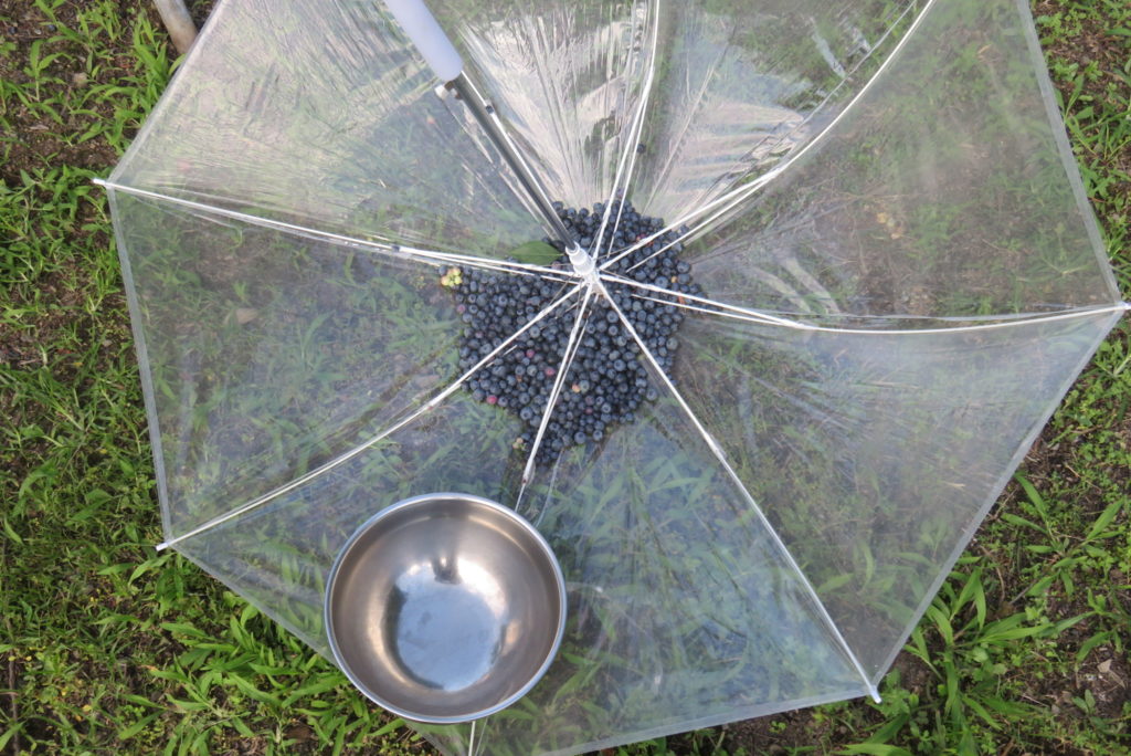 シーズンの始めのうちは丁寧に手で摘み取っていたが、手のひらからこぼれる事もある。これはもう「樹を揺らせてカブトムシやクワガタを採る時の作戦でいこう!」と思いついて、ビニール傘で受ける方法に改めた。