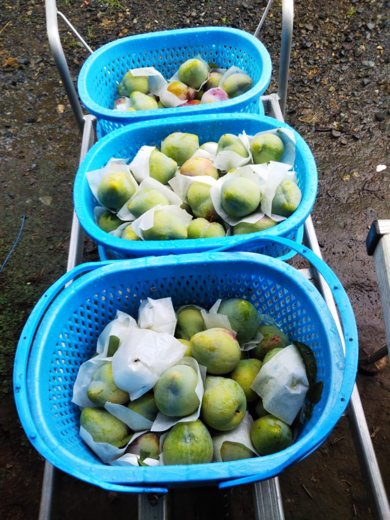 今年2022年はというと、異例のコースを通る台風の影響もあって、8月の月末から雨天が続いたため、昨年の苦い思いが頭をよぎった。このままでは昨年と同じく沢山の実が落ちる可能性がある。予測通り急激に実が落ち始めた。幸水梨の収穫がひと段落していた事もあり、今日はためらわず収穫することとした。