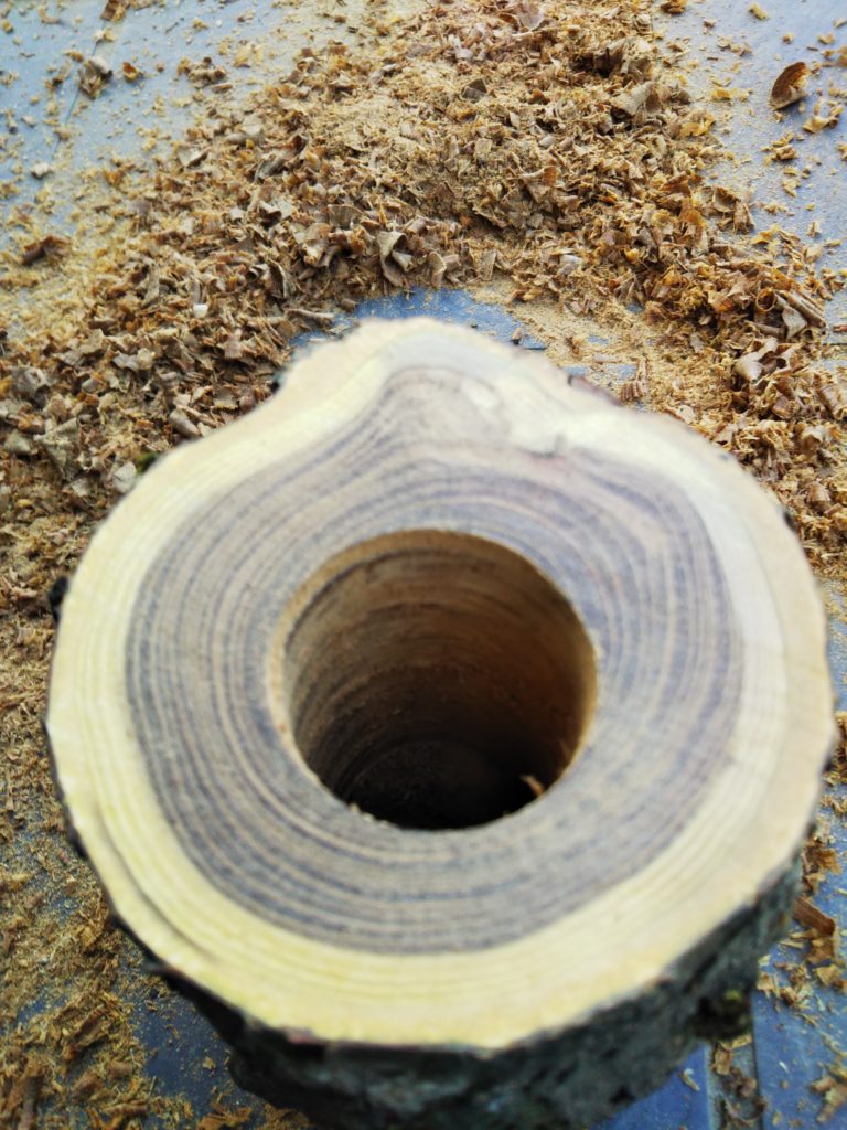 なるほどと思い、完成イメージを絵にして提案者のUさんに見てもらった。そこで、差し込むボトルを求めて100均ショップを見て回った。穴あけは小鳥の巣箱を製作するために使用した直径26㎜のドリルを利用するつもりだった。その穴に入るボトルが必要だった。しかし、なかなか良いものが見つからない。調味料、例えば塩や油を入れる小さなボトルや、携帯用の消毒用アルコールを入れるボトルなど、あれこれ探して直径を図るとわずかに大きい。