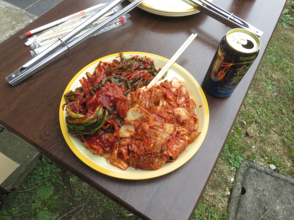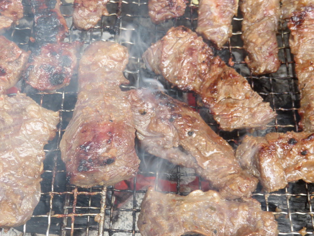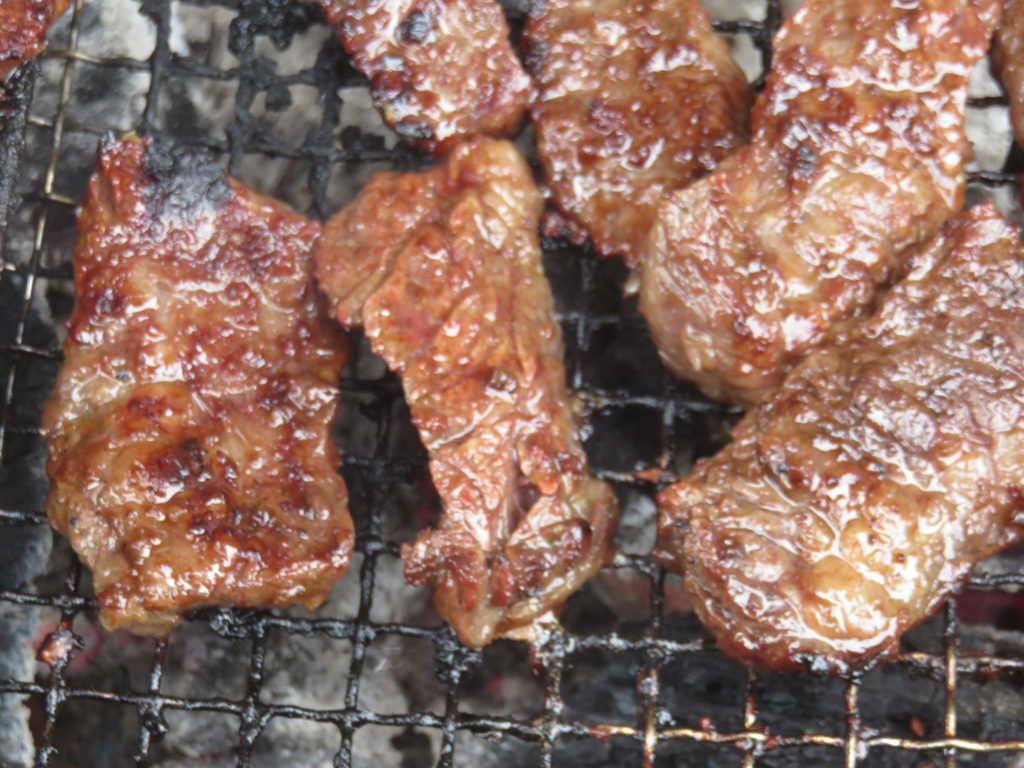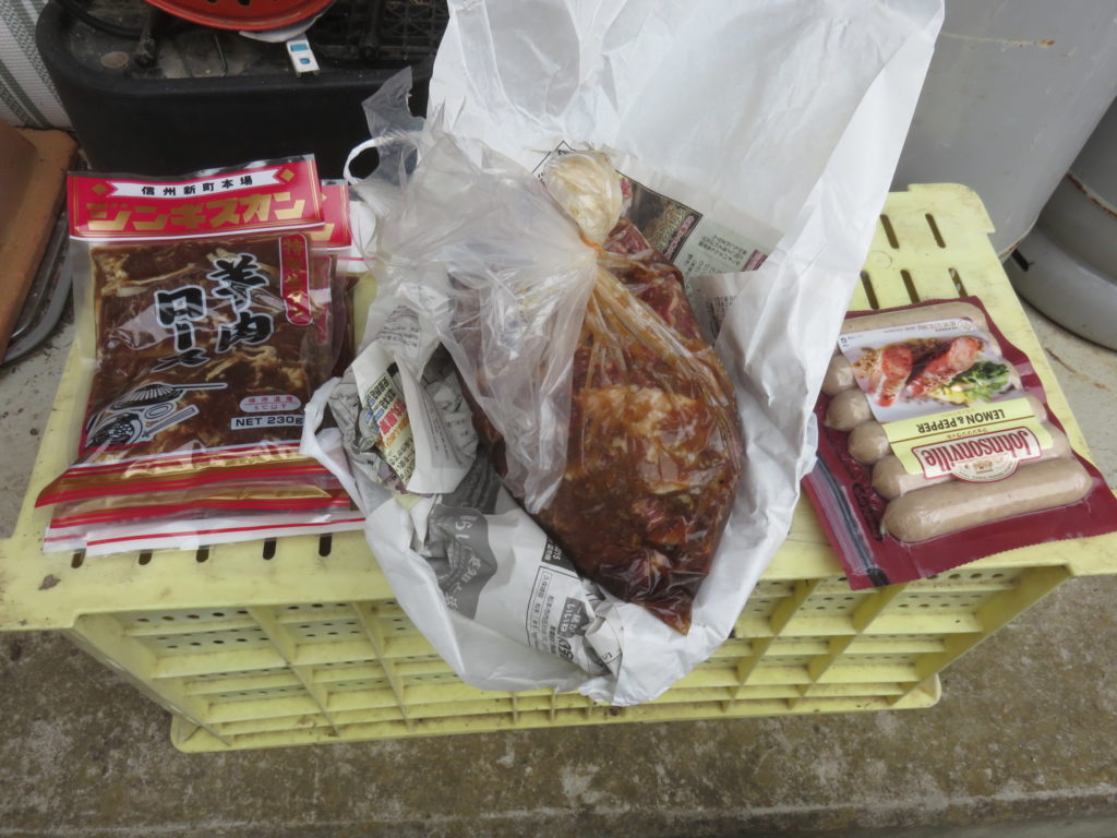こちらの地域では秋祭りとなった。それでは、梨の収穫を祝って「収穫祭をやろう!」と、家族の意見が一致して焼肉パーティーをやる事にした。肉は高橋精肉店でハラミ2Kgを購入。加えて妻と娘が長野市に行った帰りの途中にある信州新町で購入してきたジンギスカンも登場。キムチほか野菜もそろったところで、外で炭火を熾して焼いた。