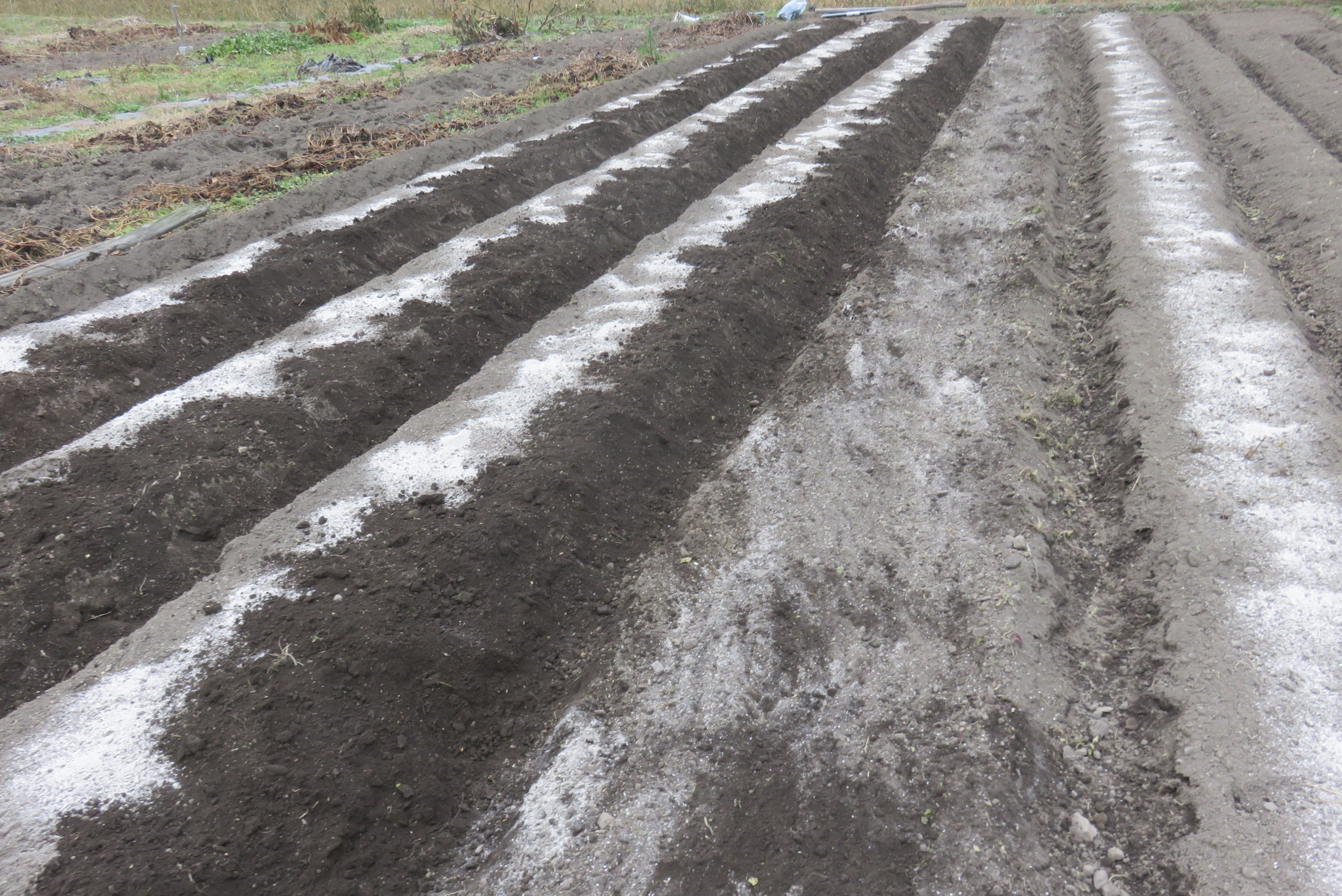 梨の収穫で忙しくしていたため、野菜畑の作業が遅れ気味だ。サツマイモの収穫を終えて、畑を起こして畝を立てる前に、苦土石灰や鶏糞をいれて耕しておいた。その後もみ殻をまいて再度耕した。