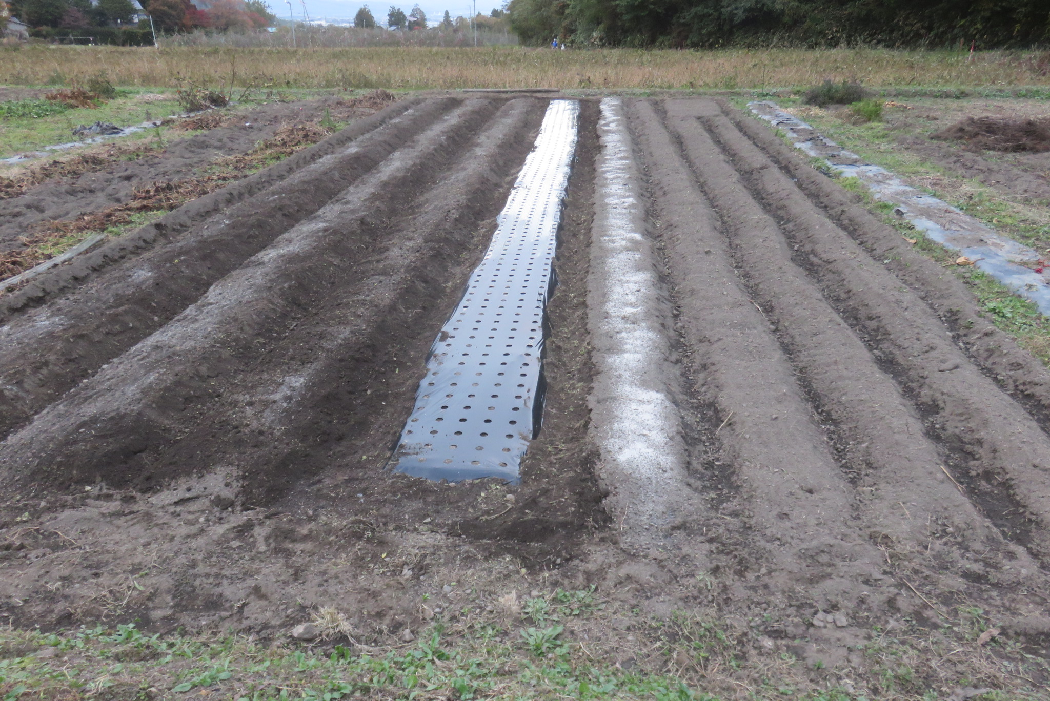 穴あきマルチを敷いたが、これで畝の立て直しは3度目。土が柔らかくなっているため初回よりは楽になったが、4通りの畝を整えたところで16時近くになり風も冷たくなってきた。1通りにマルチを敷いたところでギブアップ。腰も痛くなったので退却とした。