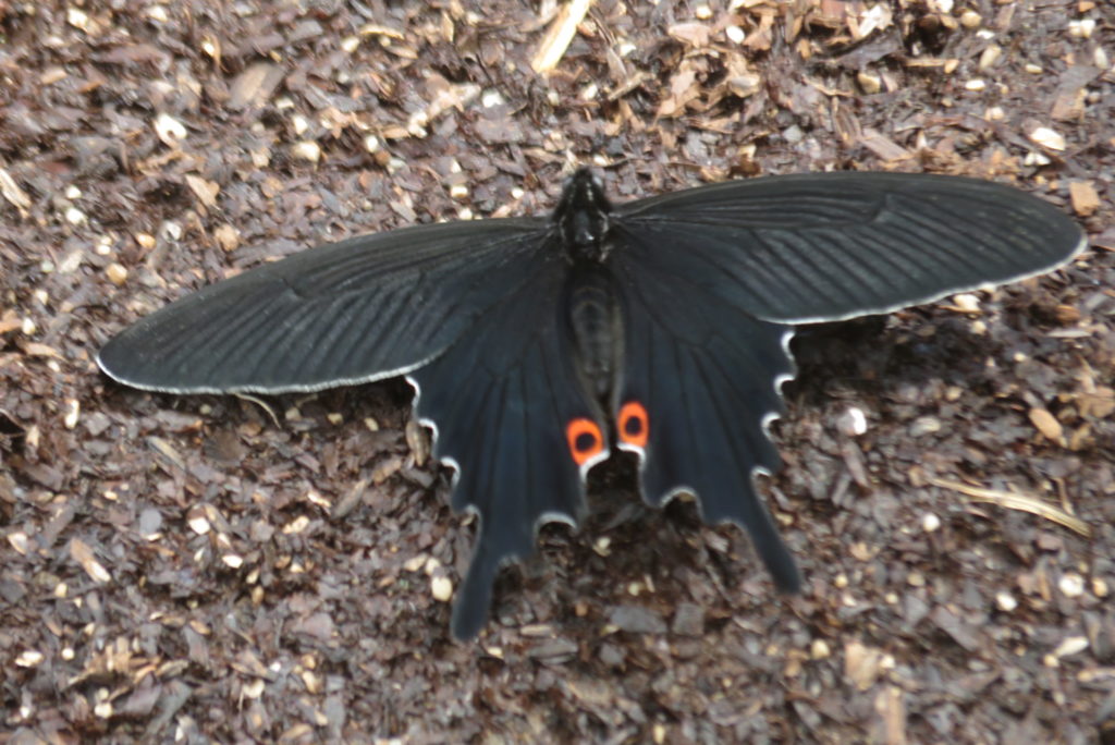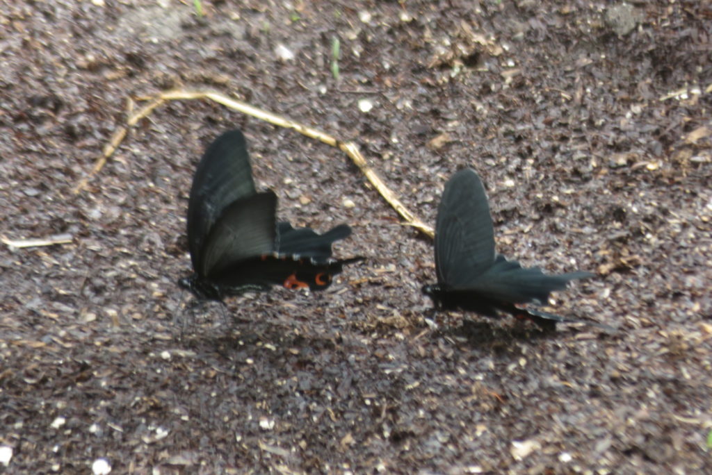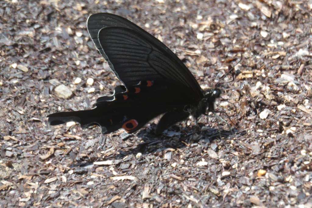 畑での作業中、水分補給のために休憩しようとしていたところ、堆肥を積んでいた場所の、わずかに堆肥が残る場所にオナガアゲハがやってきた。置いていたのは完熟発酵堆肥で、臭いの少ないものだったが、わずかなアンモニア臭に誘われたのだろう。このアンモニア臭を好む蝶は多い。