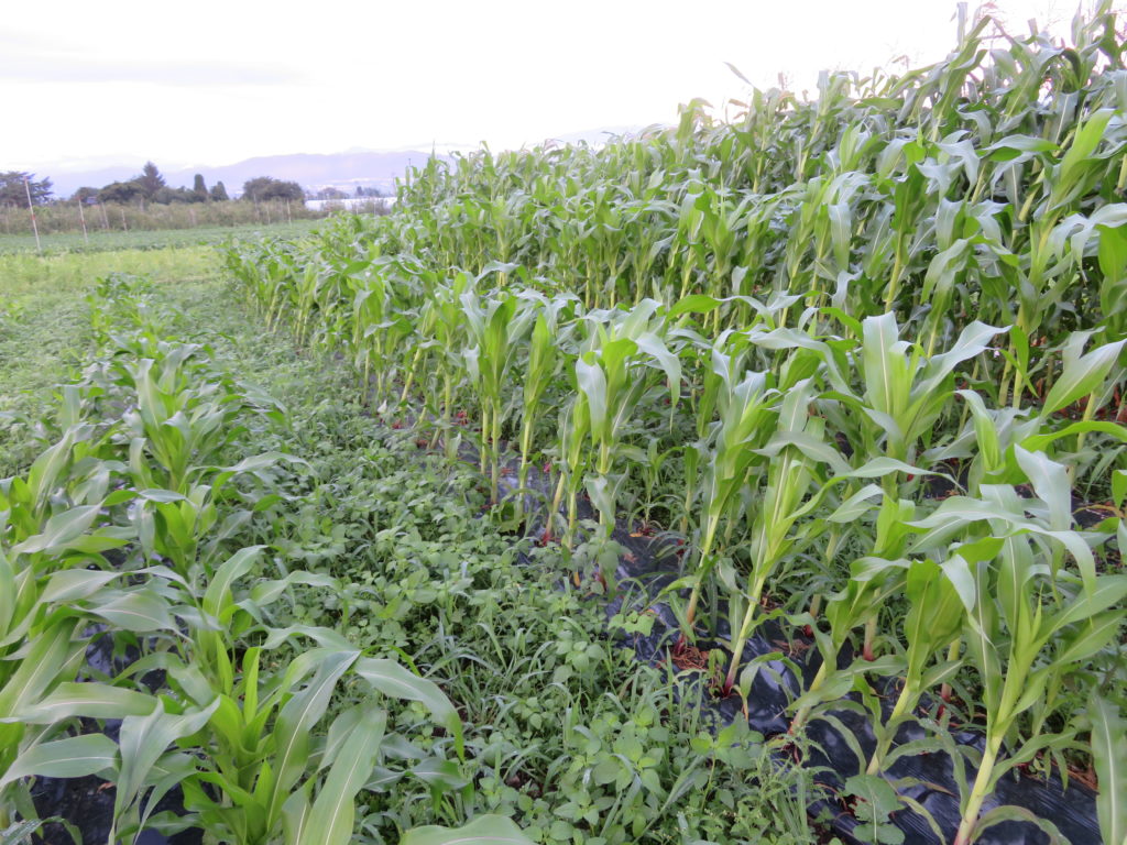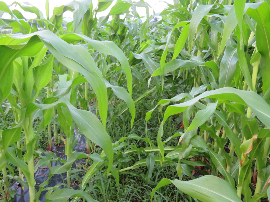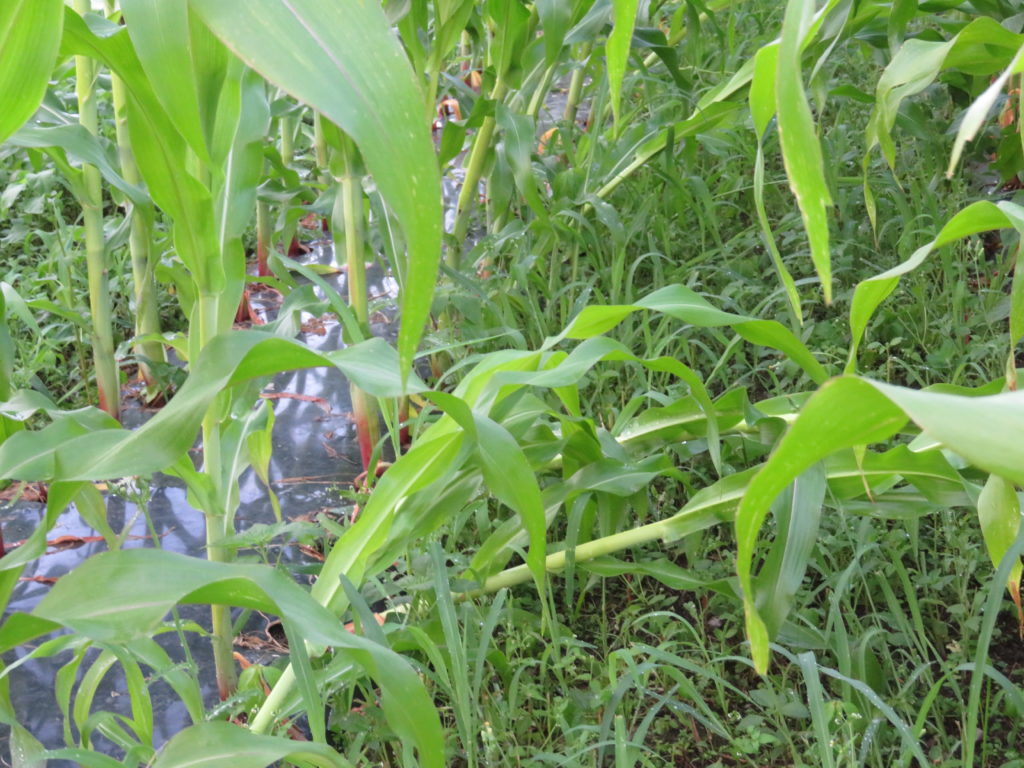 大和ルージュの定植時期をずらしながら6グループに分けているが、最初のグループは背丈が3m近くになっている。 第1グループはほとんど問題がなかったが、1.5mから2mほどで雄穂が出始めた第2、第3グループの一部が倒れていた。