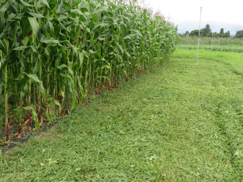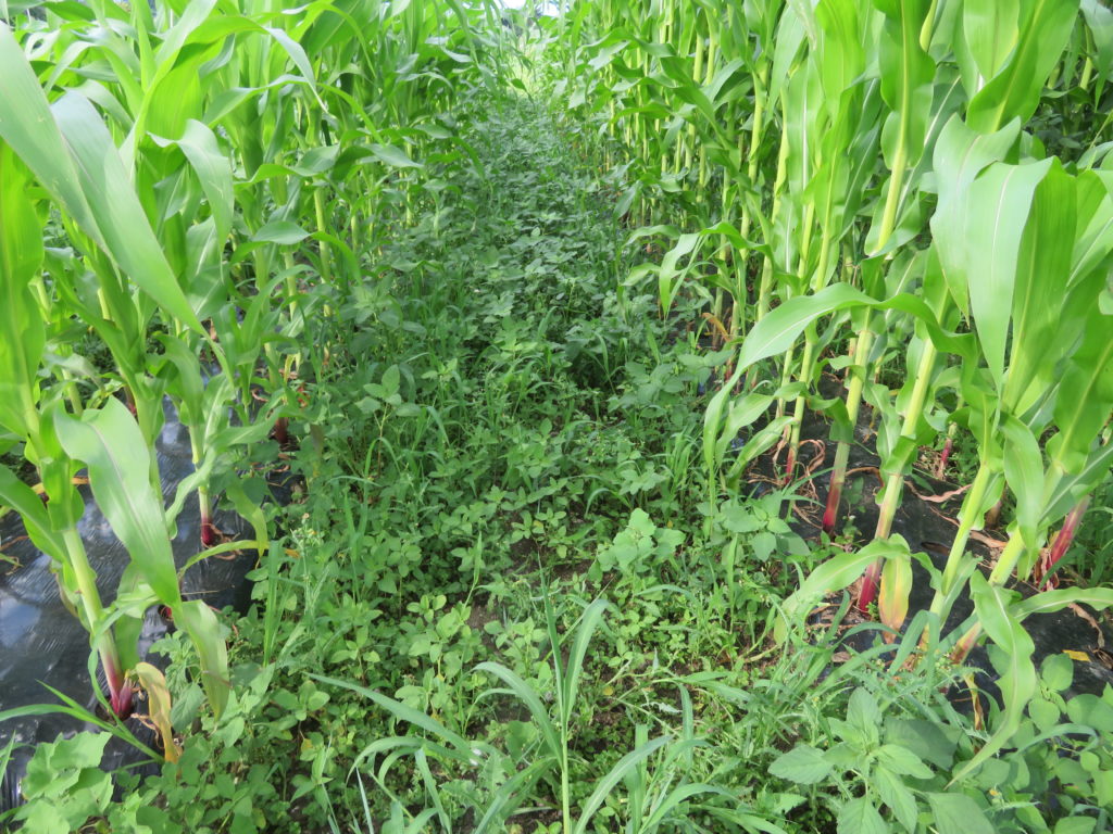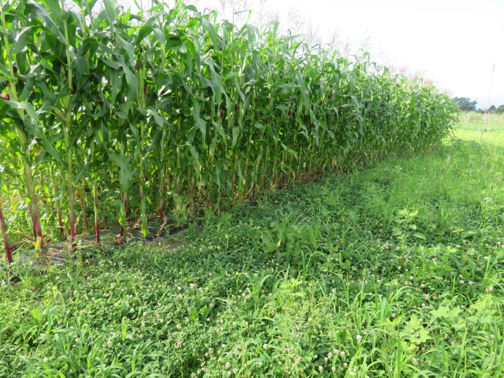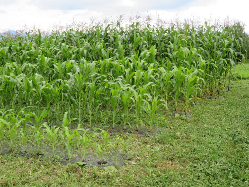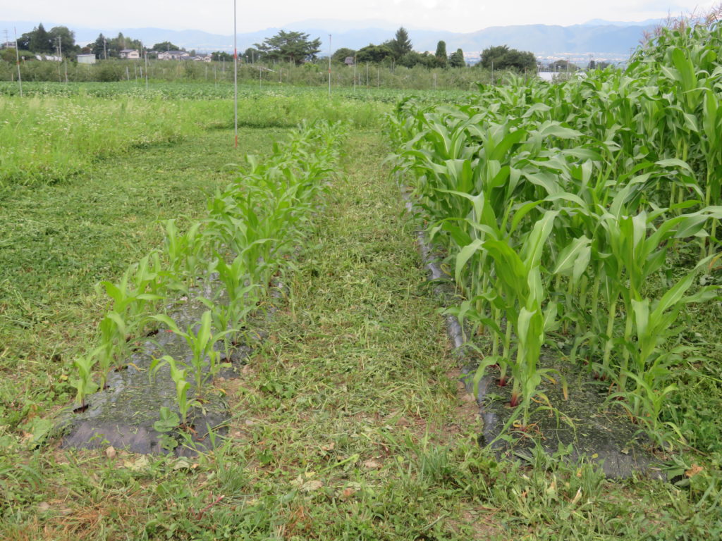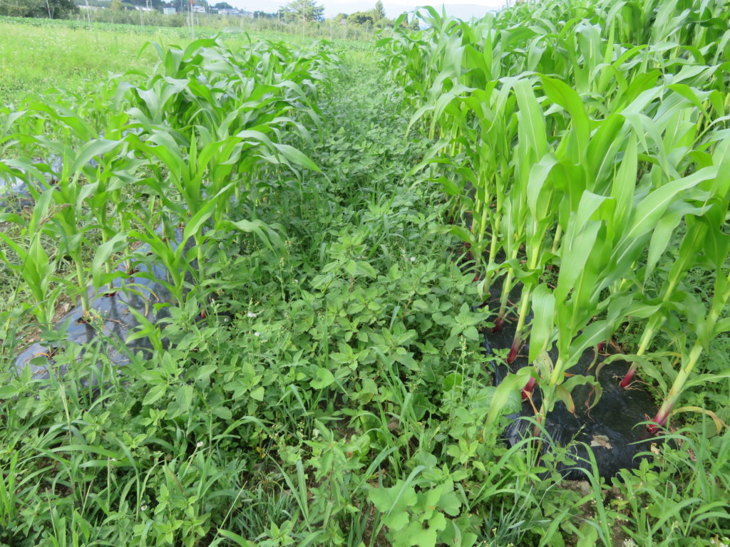 室山東の畑は、将来は果樹を植えるつもりだが、今シーズンはトウモロコシを植えている。面積としては畑全体の10分の1ほどだが、果樹園も畑も雑草は良く育つ。