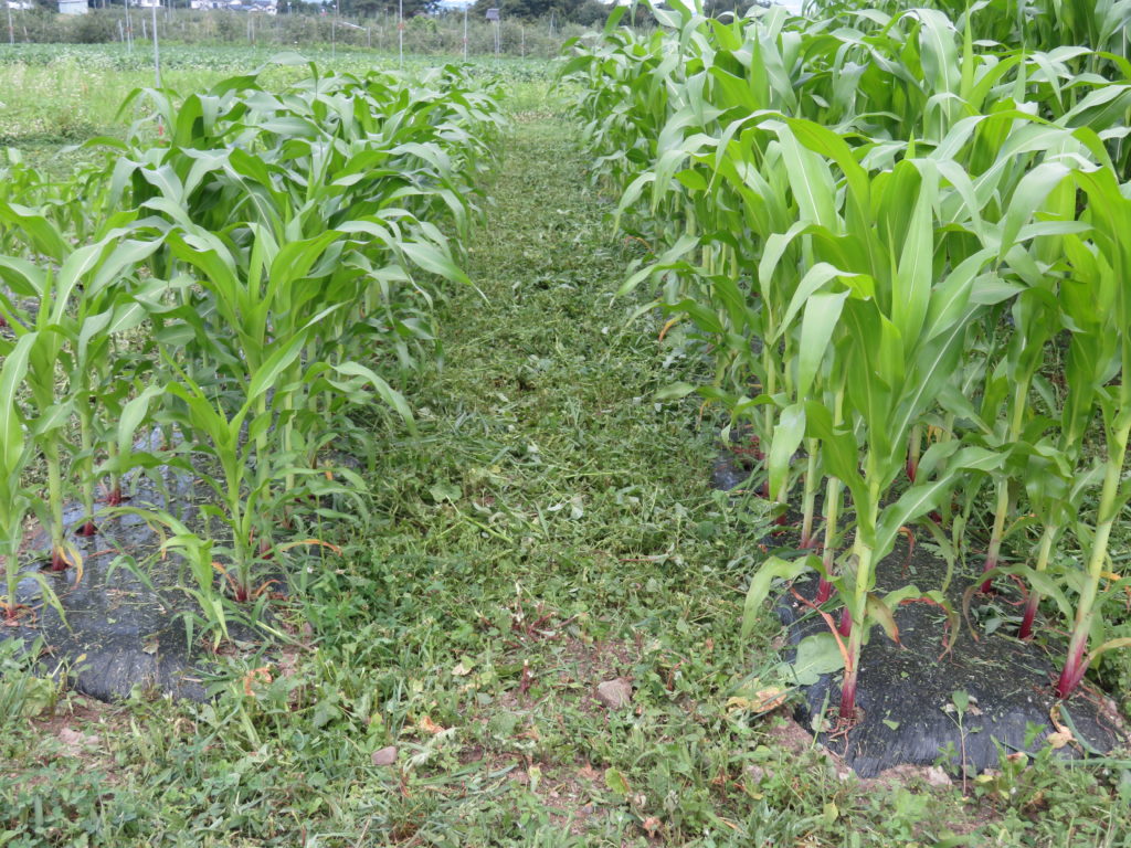 先日、室山西の畑の草刈りをしたばかりだが、東の畑も放置できなくなっている。トウモロコシは6グループに分けて、時期をずらしながら定植したのだが、最後に定植したものは背丈がまだ低いため、雑草に負けて日陰になったままではまずい。畑全体の草刈りはできなくとも、トウモロコシの光合成を促すためには、丈の低いトウモロコシ周辺だけでも草刈りをしようと決めた。