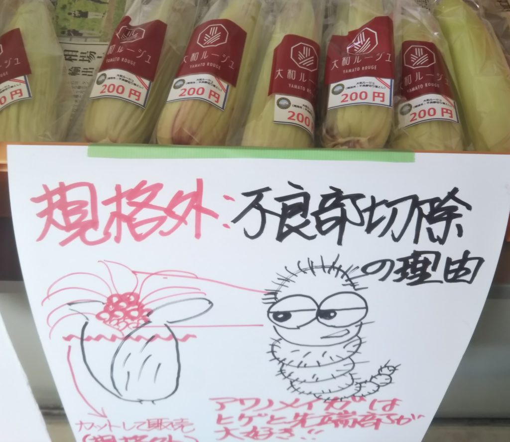 トウモロコシ栽培において悩みの種となる「アワノメイガの侵食」だが、低農薬栽培でやっていたため、規格外のいわゆる訳あり品となってしまうものが多数あったので、初日は試食と情報提供にとどめ、翌日の8月18日には先端部分をカットした規格外品を無人販売した。