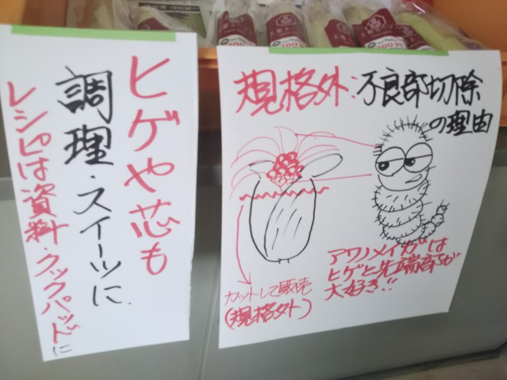 先端部分をカットすると、水分の消失が早いことなどから商品価値は下がる。また、その理由についてもしっかりと説明する必要があると思ったので、イラストをそえて説明を記載して1本200円とした。