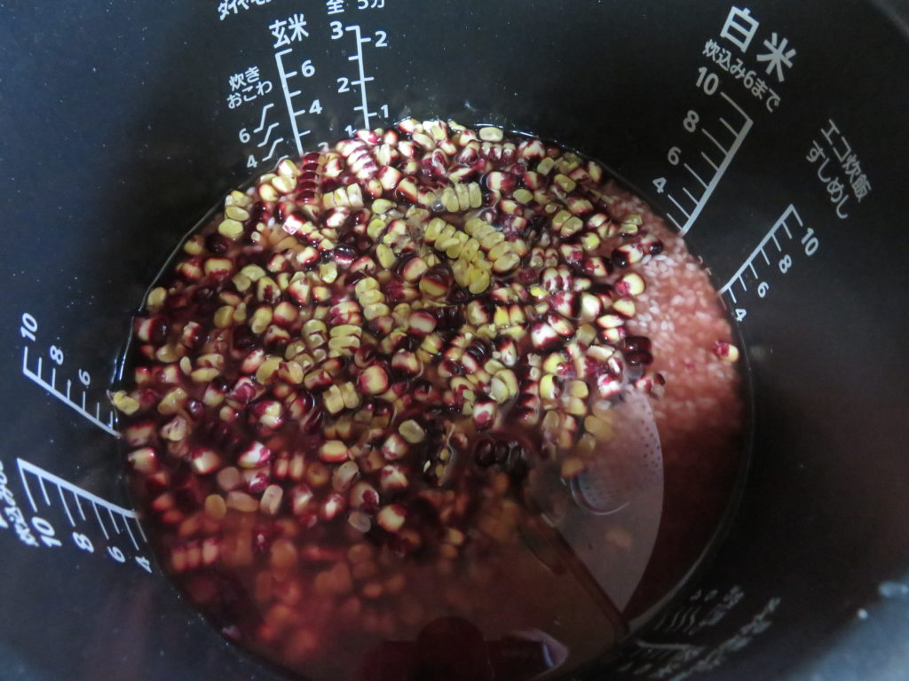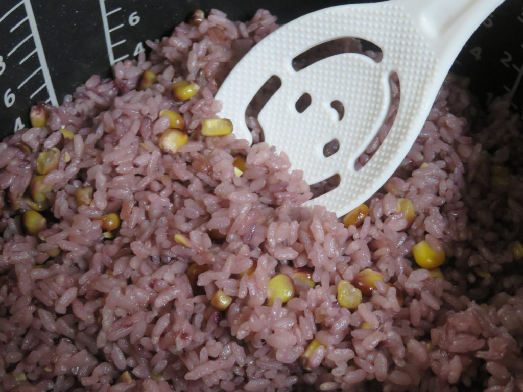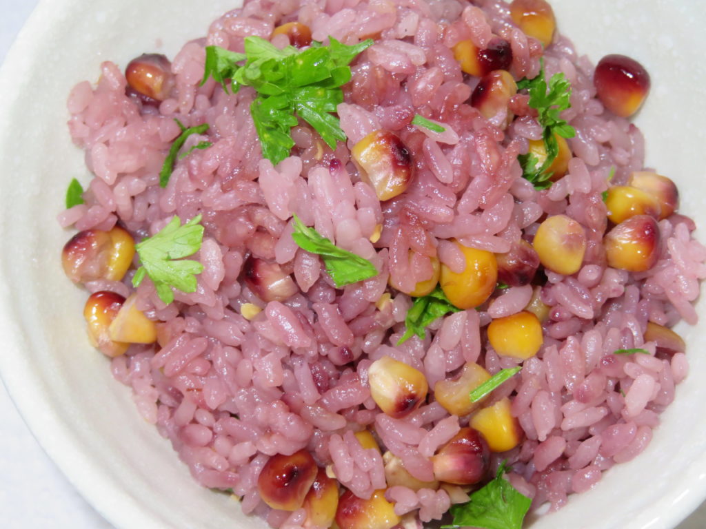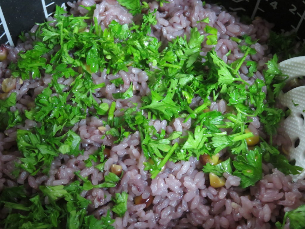 私も娘と炊き込みご飯を作ってみた。ヒゲと芯をゆでた汁を、洗った米に加えて炊いた。発色もよく、パセリをきざんで振りかけた。