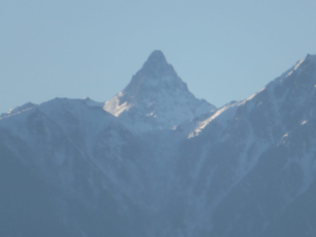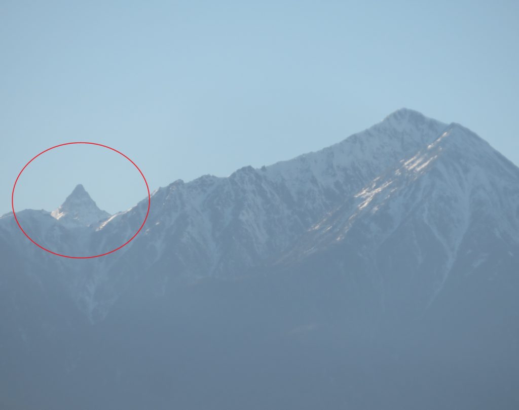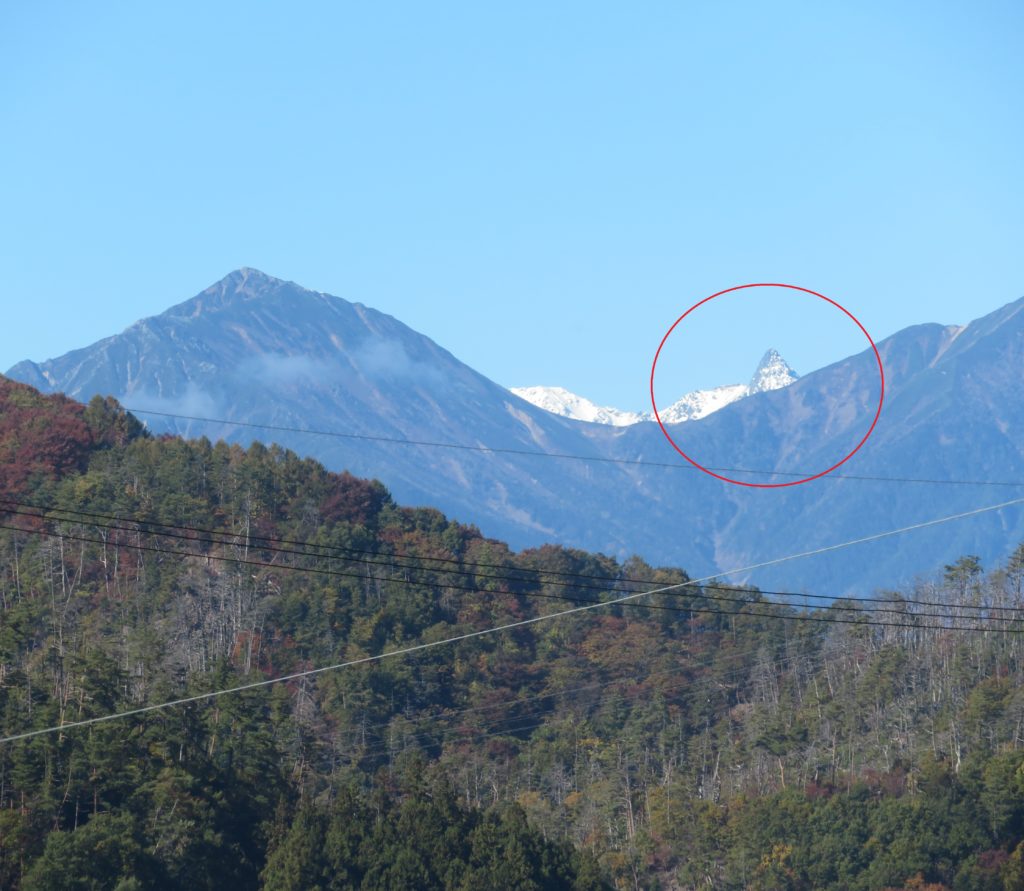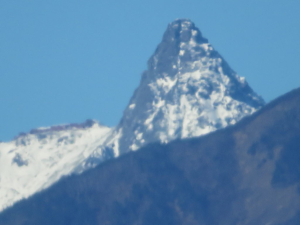 私がよく目にするのは、松本城あたりからの(常念岳の)右に見える槍ヶ岳で、松本市里山辺あたりからすこし東からだとさらにはっきりと槍ヶ岳が見える。