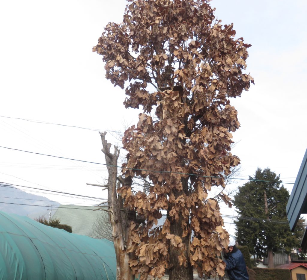 写真の柏の木の横には、すでに枯れていた杉の木があるが、ここにはコムクドリの巣箱をかけて2年連続営巣を確認したが、1年目はヒナが巣立ったが、2年目はアオダイショウに襲撃されてヒナが無事に巣立つことができなかった苦い経験がある。この杉の木は近く切り倒す予定だ。