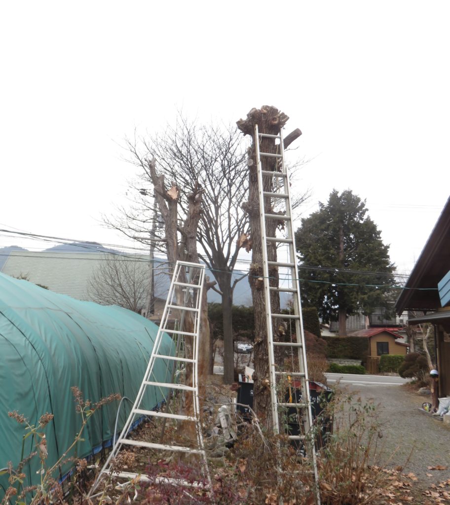 幹の高さは7mほどあろうか、5年以上前になろうかと思うが業者に頂上を水平にバッサリと切ってもらったまま放置していたもの。その上にさらに枝が伸びて10m近くの高さになっているようにも思える。