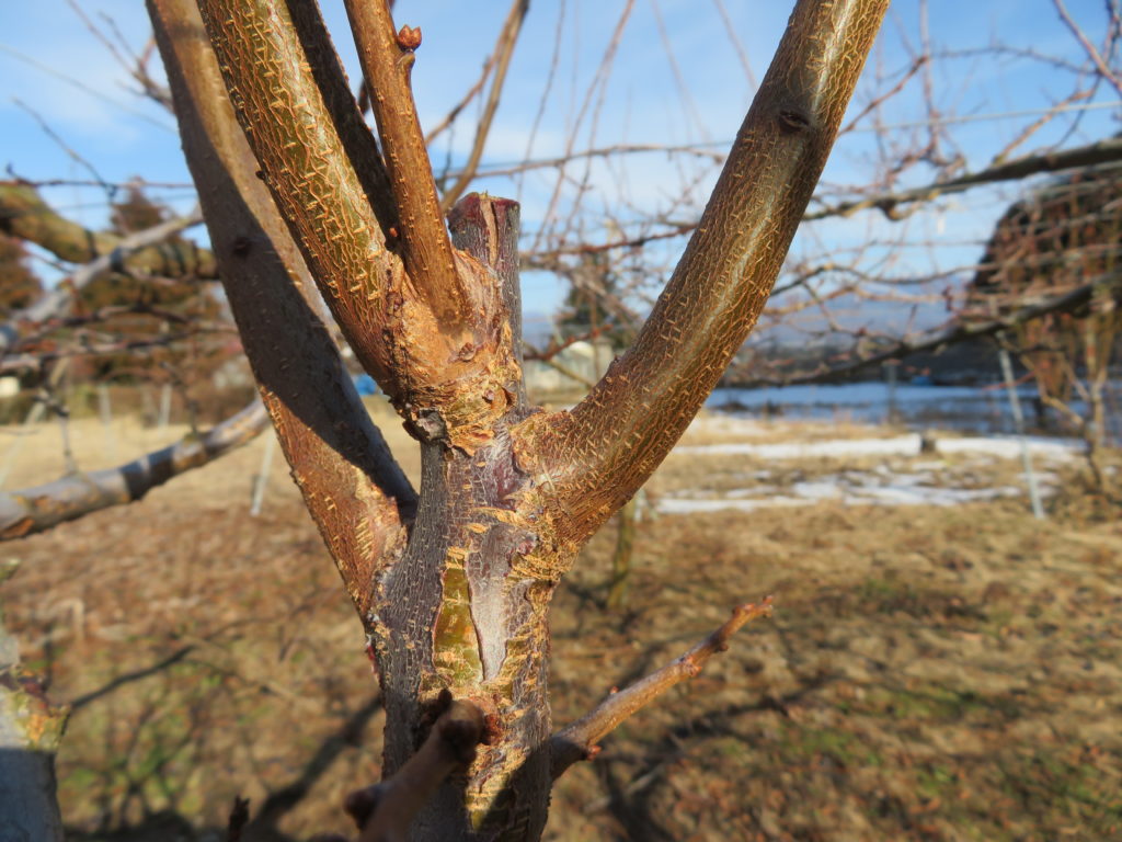 枝をコントロールして、シーズン開始から収穫を終えるまでの様子を思いながら、自分なりに園の果樹の「樹形」をデザインする仕事だからです。時として時間をかけて太くなった枝を切る場合があります。事情はいろいろあります。老朽化や傷、病気などで花芽をあまり付けなくなり、若い枝に更新する場合。また、想像していた(枝の)配置から逸脱して枝と枝が重なってしまったり、本来の成長方向とは逆向きに伸長して、作業効率低下を招いたり、促すべき光合成に悪影響を与えそうな場合です。