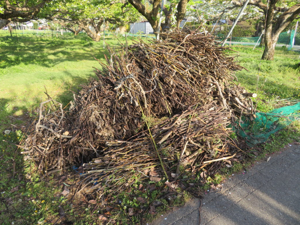 今回は特に思い切った剪定をした結果でもあるが、残りはこれまで通り燃やして炭にすることとした。この剪定木の処理に限らず、使用する薬剤や農業用資材のほか、包装材などでも環境負荷が問題視される。少しずつでも減らしていきたいと考えている。