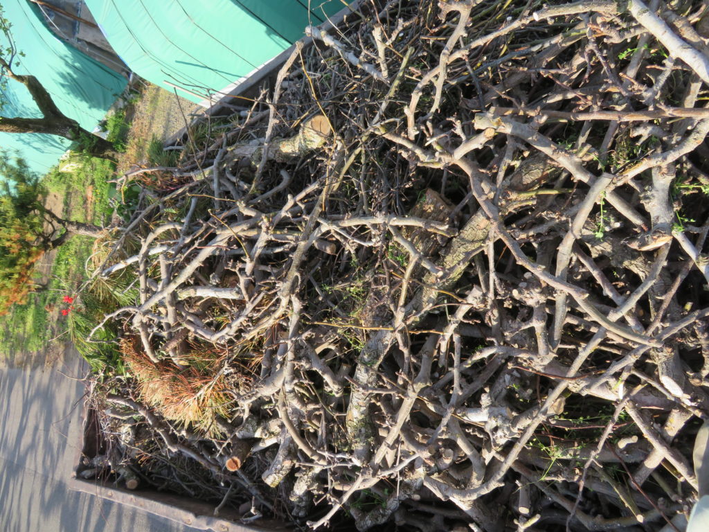写真は、業者に処理をお願いし12立方メートル(立米:りゅうべい)のコンテナに積んで大型トラックで搬送した時のもので、2箇所に集積した剪定木だけでコンテナがいっぱいになった。その他にも山積みしているものがあるので、それらをすべて業者にお願いするにはコンテナがもう1つ必要になりそうだった。それに、冬季に剪定しつつ焼却していた剪定木を含めるとかなりな量になったはずだ。