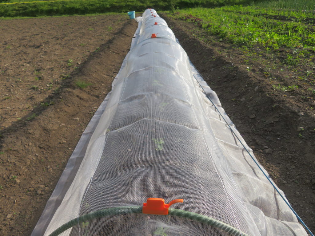 あらかじめ用意していた畝にポットから出して定植。防虫ネットをかけて、2週もすると雑草が生えてくるので、内部の雑草を取り除いた。その際に、ナナホシテントウムシの幼虫やサナギを発見していたが、益虫なのでそのままにしていた。