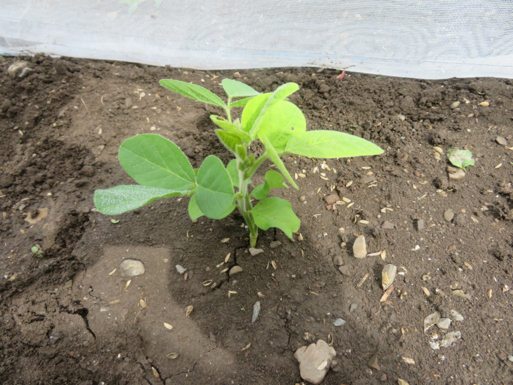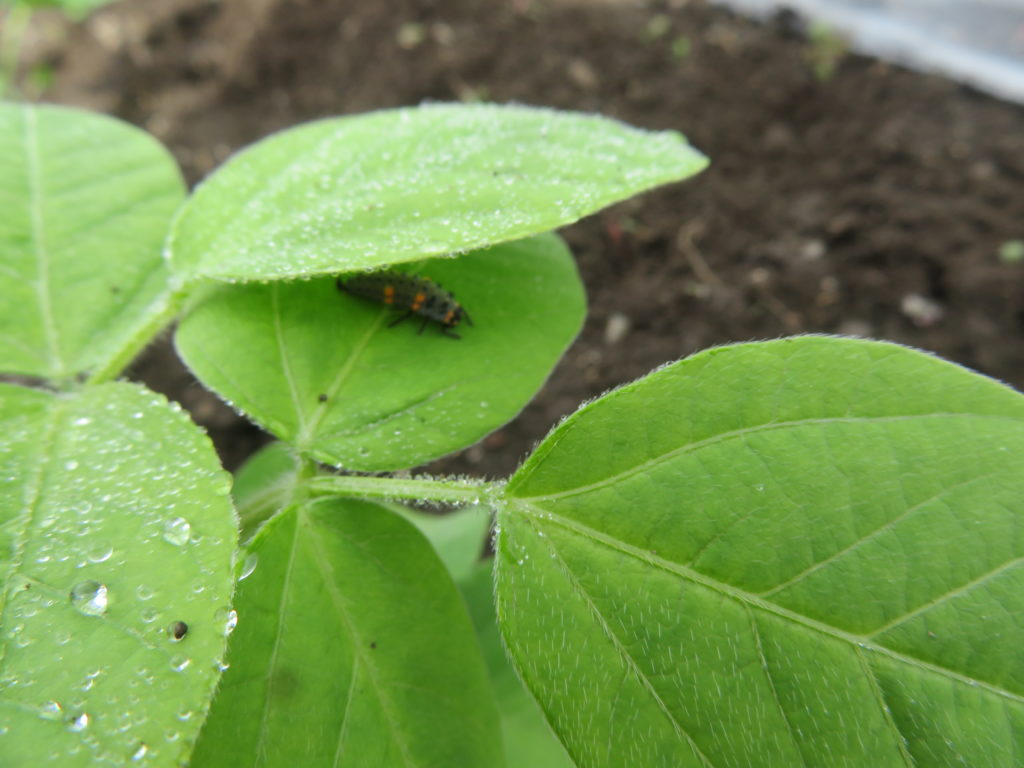前回は、定植直後から虫に葉をほとんど食べつくされた苦い経験から、今回は防虫ネットで守ろうとしている。先週はネットを開けて草取りをした。その際に、ナナホシテントウムシの幼虫やサナギがついている事は容認していた。ナナホシテントウムシはアブラムシなどをやっつけてくれる益虫で、枝豆の葉を食害することもない。
