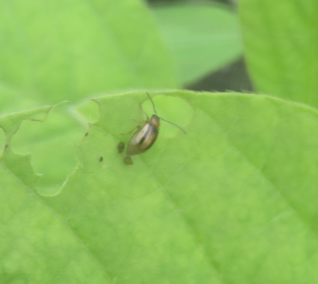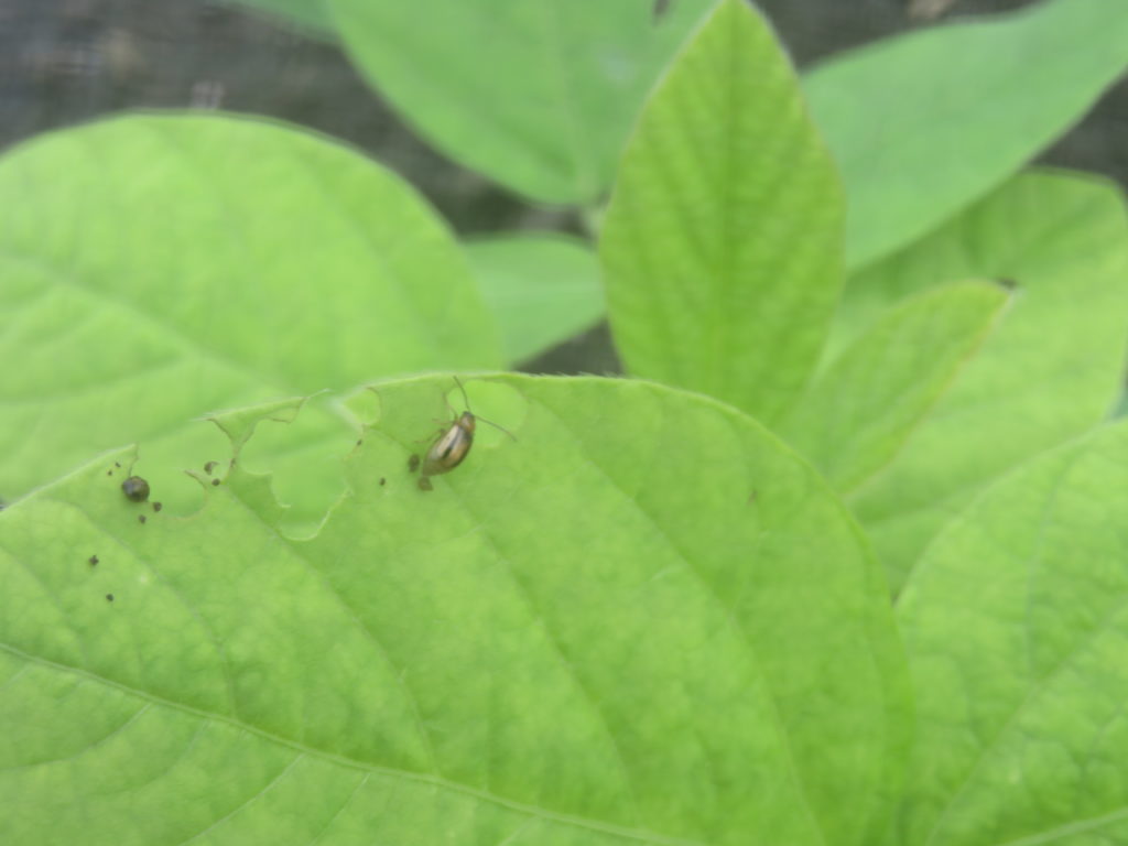 しかし今日、ネット越しに内部を確認すると葉がボロボロになっている。よく見ると葉の穴の部分に食事中のフタスジヒメハムシ(Google画像検索による)がいた。フタスジヒメハムシはマメ科の植物が大好物らしく、幼虫は根を、成虫は葉を食べるらしい。