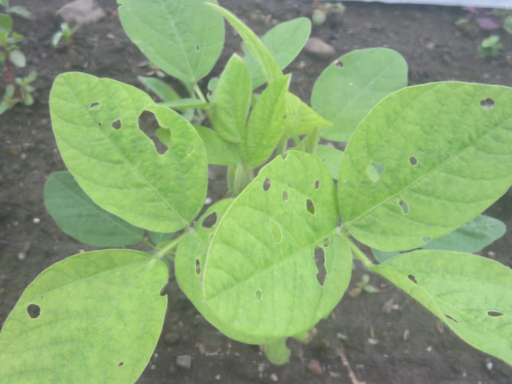 草取りをして1週間後に観察すると、葉がボロボロになっていた。よく見るとフタスジヒメハムシが美味しそうに葉を食べていた(泣)。昨年は、葉がまだ小さなうちに食害されて、枝豆はほとんど成長できず失敗に終わった。今回は何とか阻止したいのだが。