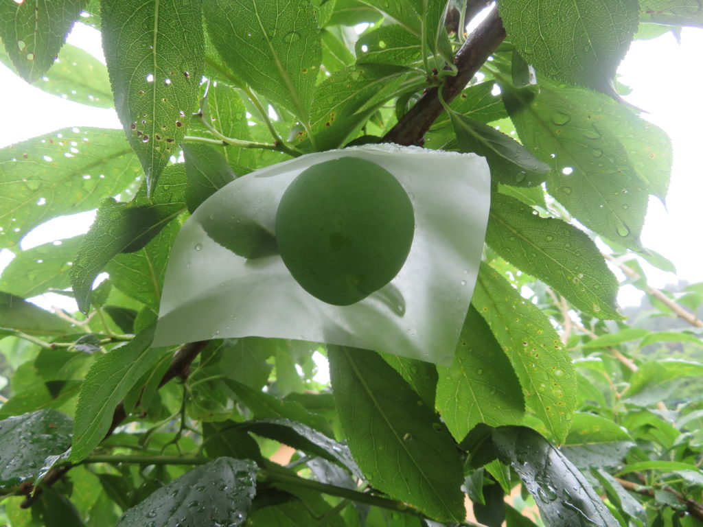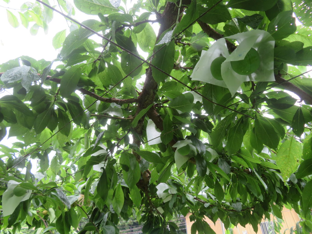 今日は仕事を終えて帰宅した夕刻でも空が晴れて明るかったので、続きの作業をして100枚ほど紙傘を掛ける事ができた。貴陽は他のスモモと違い、ヘタの付近に輪紋が発生しやすいので紙傘掛けが必要だ。今日は三脚を使わずに手の届く範囲をやったのだが、週末には残りの作業を完了したい。