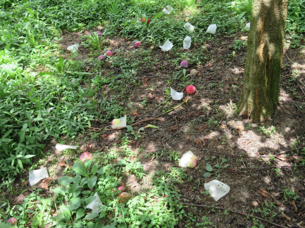 梨畑以外に、昨年から始めた室山西の畑に加えて、今年からは室山東の畑も耕作を開始している。東の畑にはトウモロコシを植えていて、時期をずらしながら6グループを管理しているが、その第1と第2グループには雄穂が出始めたので、トウモロコシを食い荒らすアワノメイガ対策を開始した。穂を切断して間引くなどして様子を見るが、予断を許さない。梨畑の防除と合わせ忙しくなってきた。