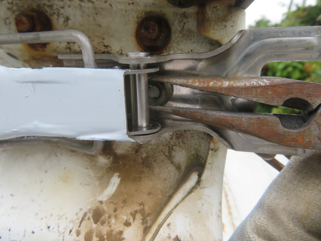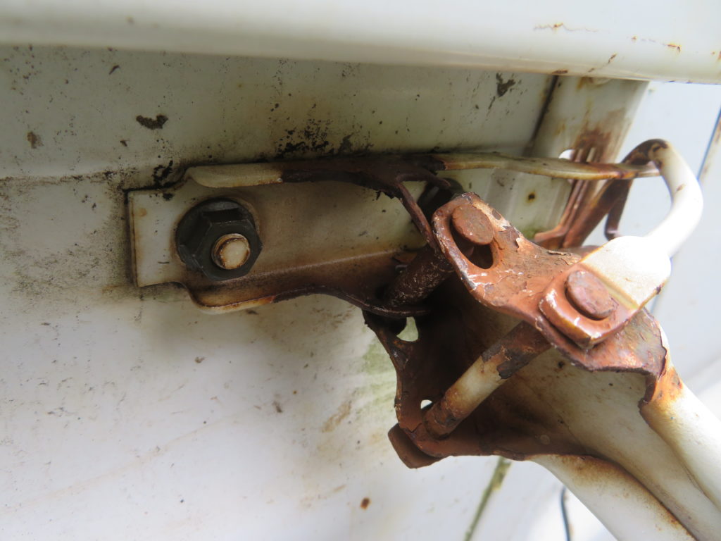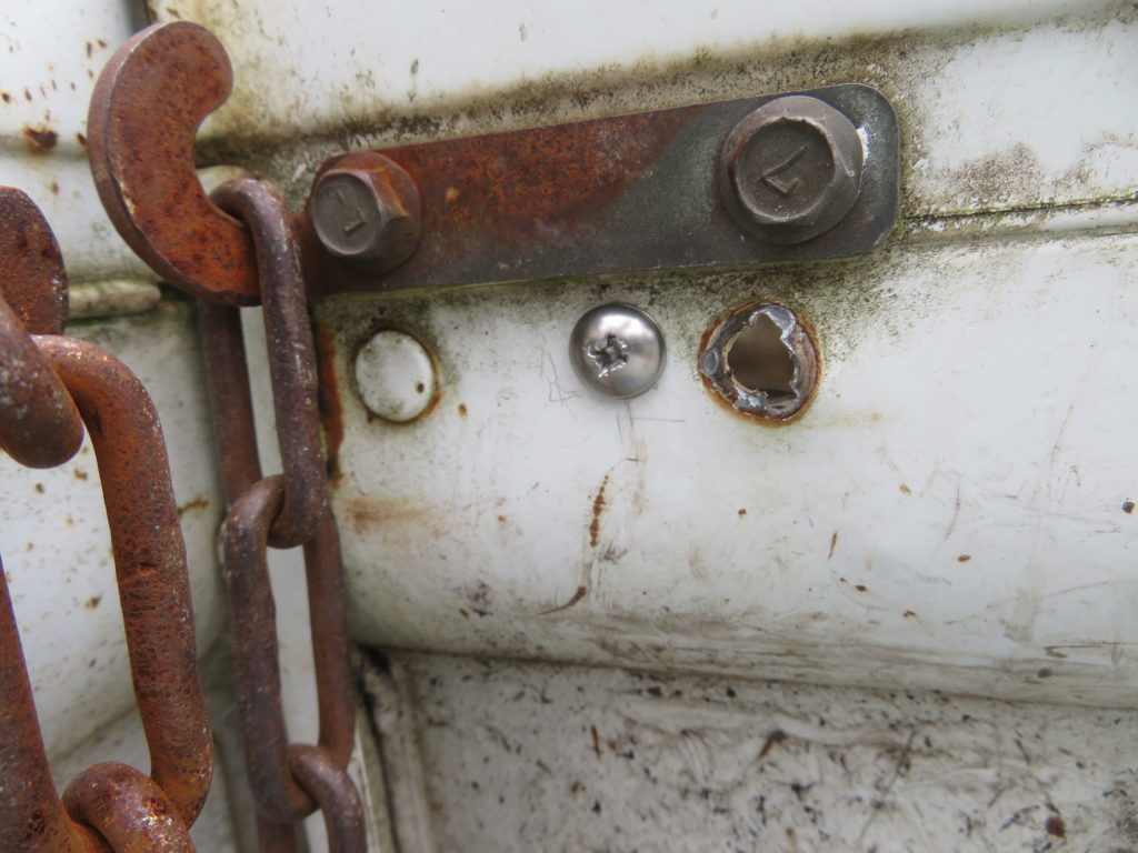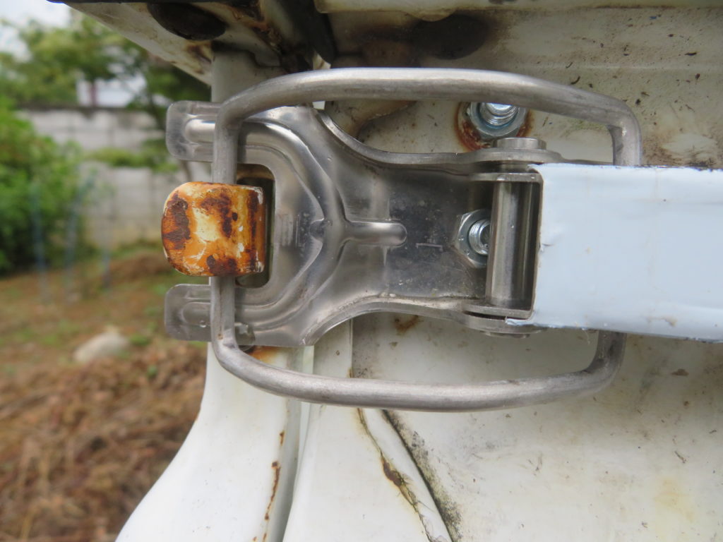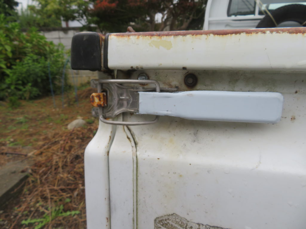 軽トラの荷台にある「あおり金具」がボロボロになっている。