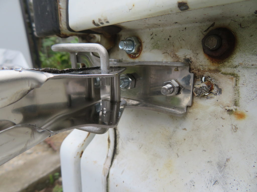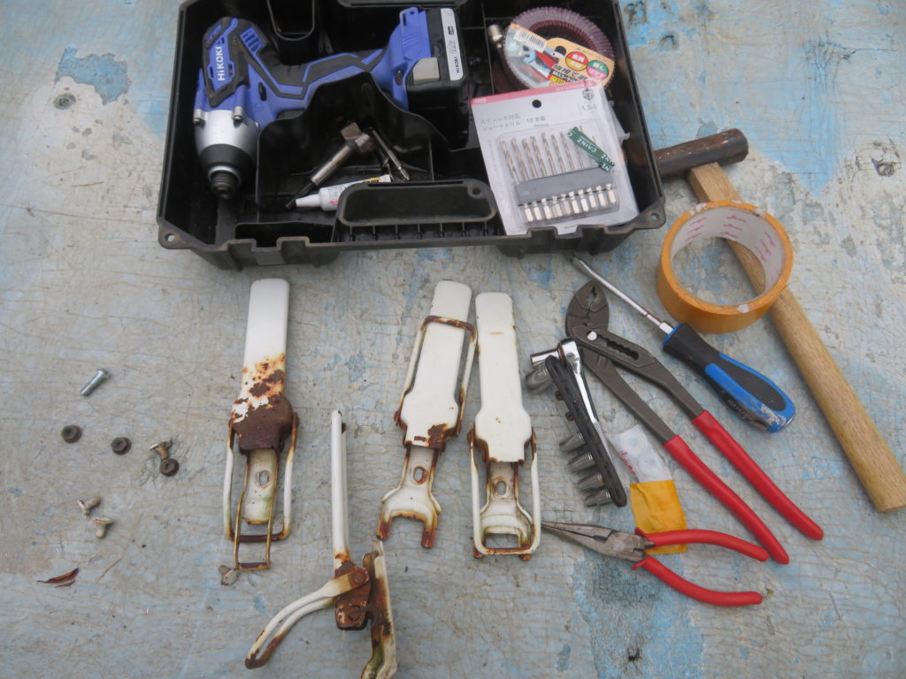 ボルトの位置が合わないので、ステンレス対応のドリルで荷台を貫通する穴を開けてナットで固定することにした。しかし、購入した部品を見てがっかりしたのは、ナットをあてようとしても金具のハンドルを回す軸の部分とボルトの軸が重なる構造になっている。