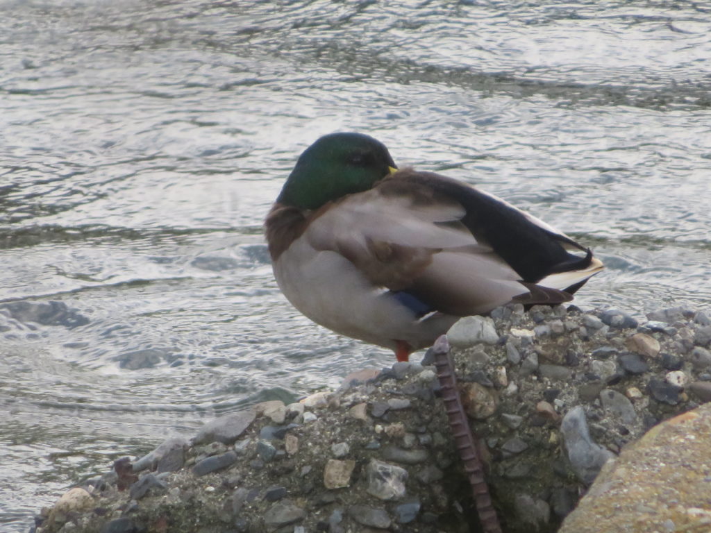 私が川沿いを通った時、マガモはだだじっとして動かず、ヒドリガモは水に浮かんで泳ぎ、イソシギは石の上を忙しく移動していました。それぞれが全く異なる様子でしたが、肌寒い中、のんびりとした様子でした。