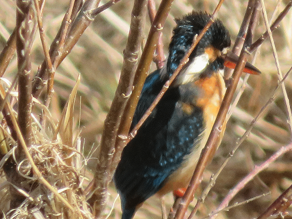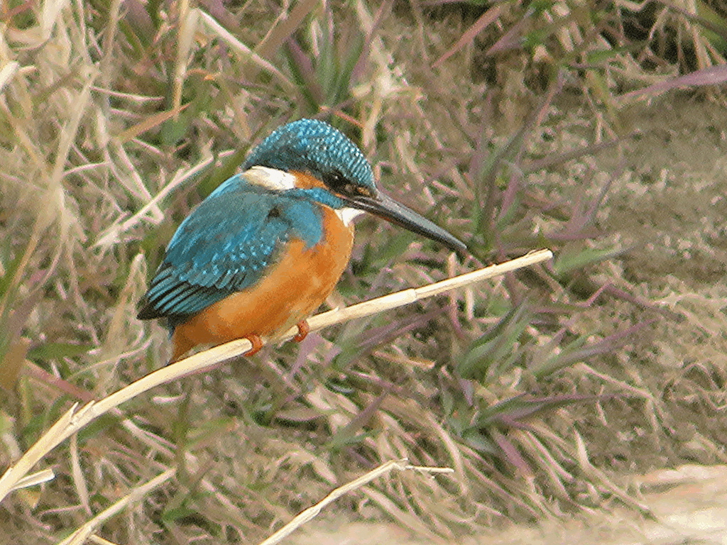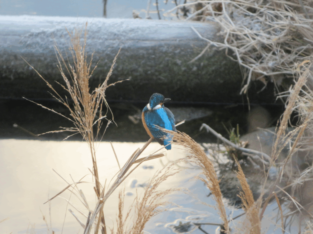 クリスマスの日になって、近くの河川敷にその姿があった。遭遇した水路からそれほど離れていない場所だ。カワセミに遭遇したのは7年ぶりだろうか、同じ川の上流で偶然見かけて、当時はガラケーのカメラで撮影したその写真には、中心部にぼんやりと青とオレンジの塊が映っていた。撮影した私だけが「カワセミだ!」と主張・認識できる残念な写真だった。