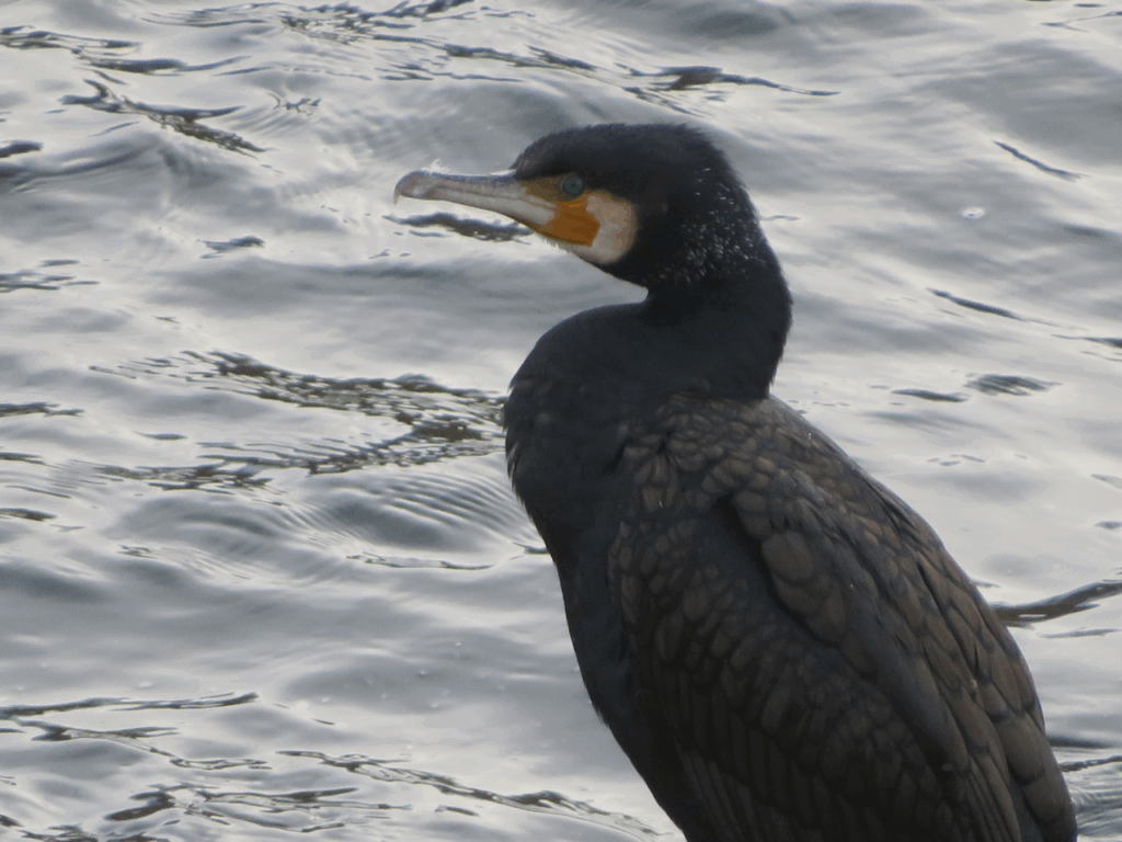 何気なく見たカワウの頭が少し白っぽく見えたので、カメラを向けてズームアップしたその姿に驚いた。これまで遠くから見て、ただ(漠然と)黒い鳥と思っていたが、頭に白い模様が混じり、目は緑色でギラリと光っていた。
