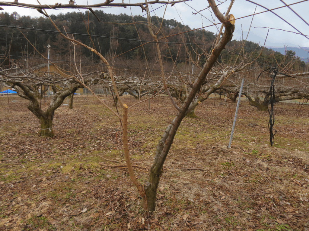 当園は梨が主力のため、隣接する梨の木を邪魔しないようにする必要がある。そのため、接ぎ木して成長した貴陽の枝も好ましい方向に伸びてくれたわけではないので、やむなく大胆な切り方をすることとなった。それでも、今年は花芽をたくさんつけている枝を残せるので、収穫増を期待している。