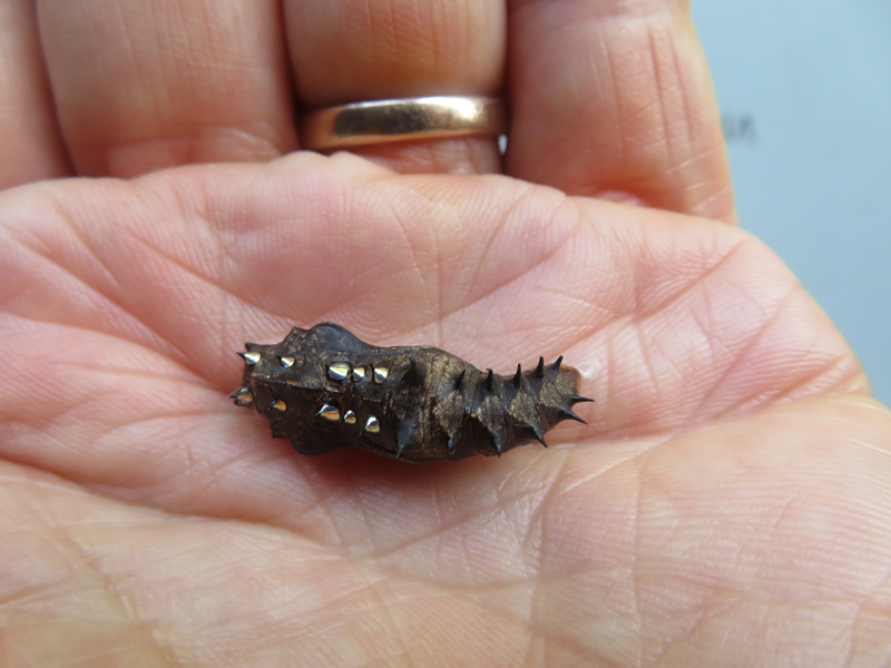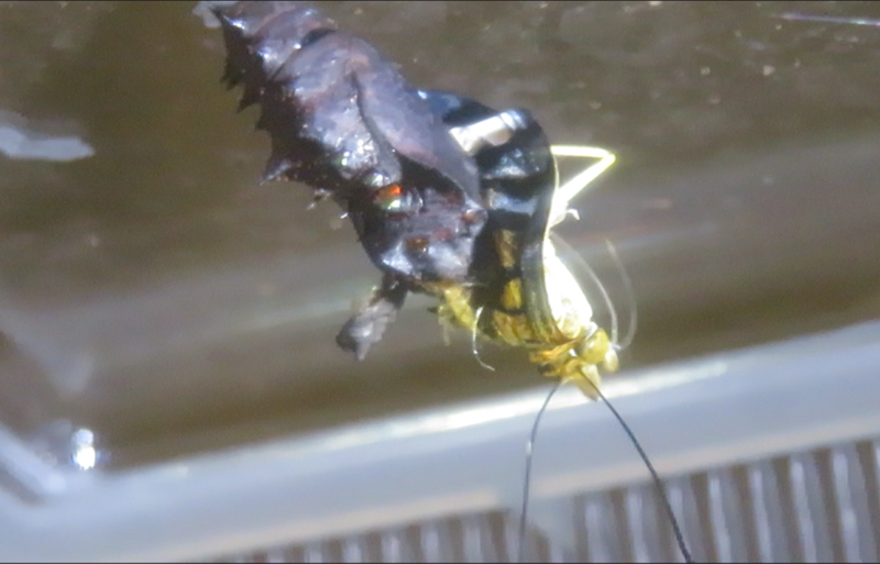 娘が「これ何のさなぎ?」と私に見せたのがきっかけで、画像検索するとツマグロヒョウモンであることが分かった。さらに、あるブログに「蛹の突起がゴールドの場合はメスで、シルバーの場合はオスなのだ」と記載されていたため、地面に落ちていたというさなぎの孵化を観察し検証することにした。さなぎはゴールドの突起をもっているのでメスということになる。とても興味深かった。